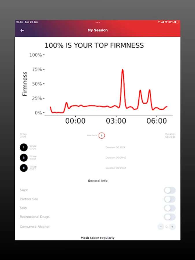 The world’s most rewarding, comfortable, and safe erection performance ring, now has an app. Download and install this app and pair it via BlueTooth with your TechRing and monitor your erections. Get real insights about your nocturnal erections while enjoying all the other benefits of the TechRing.