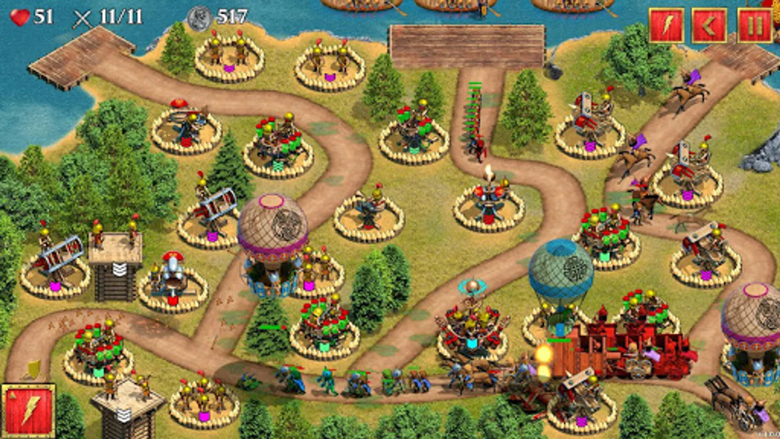 This exciting castle defense game features more than 60 levels with multiple difficulties, over 30 types of enemies to fight against, 8 types of fighting weapons and 5 types of installable gears which influence and improve the characteristics of combat vehicles. Prepare your gear to help in this challenging tower defense war and controls the battles using grenades, bombes, Tribolos, lightning, Greek fire, poisonous gas, frost, meteor rain, etc.