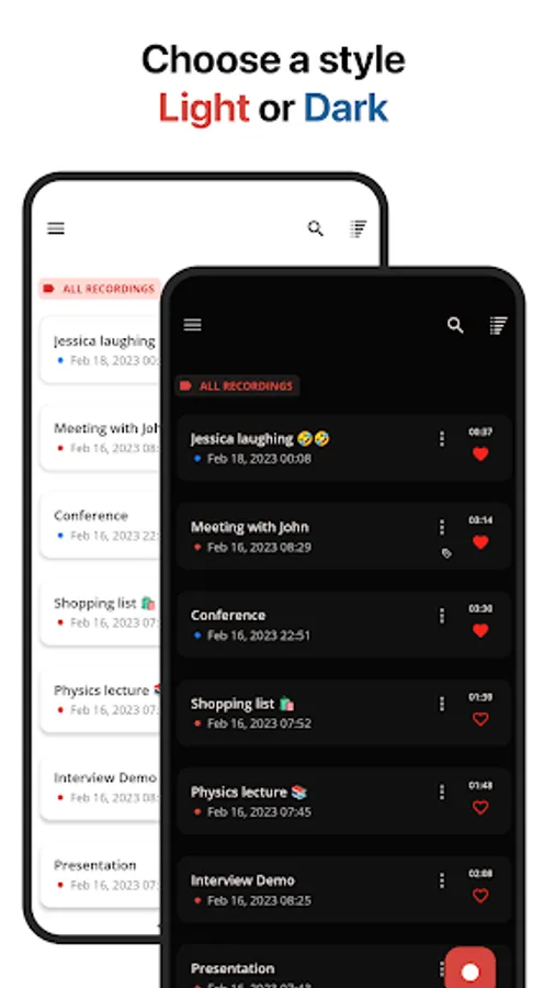 Group all your vocal recordings into defined categories. Mark your favourite talks and memos. Place recording tags, attach bookmarks, choose colors and icons. Achieve clear and sharp sound.