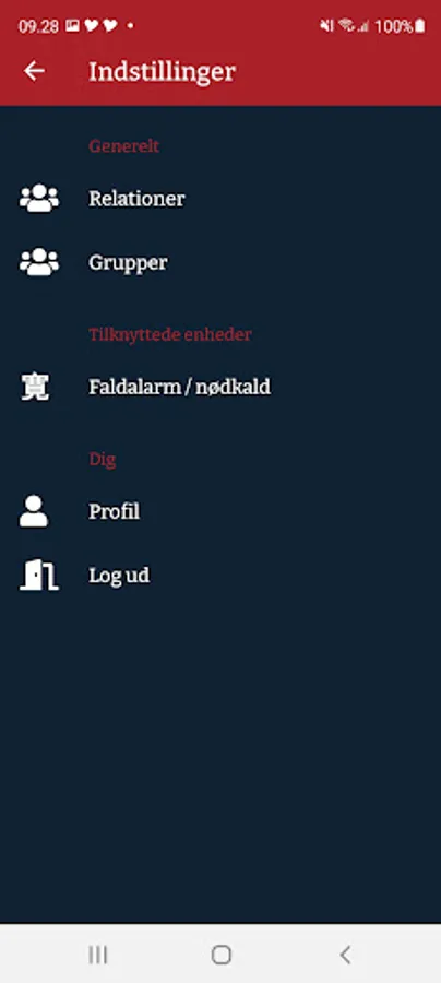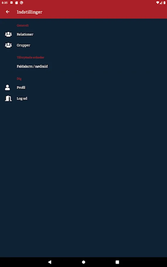 Red alarm: Pressing red alarm activates all your helpers/group. They will then get a guide directly to your position/location. You all so have the option to call 1-1-2 directly from the app.