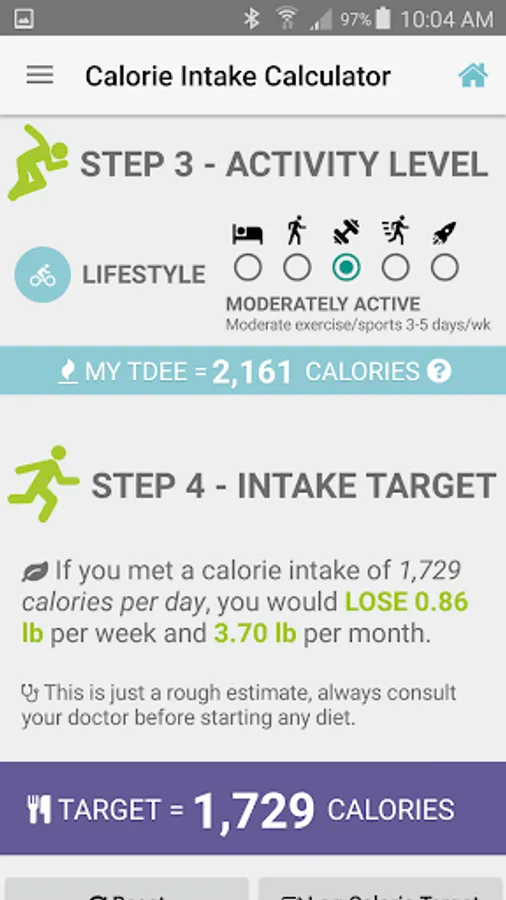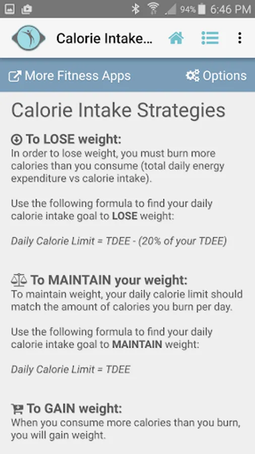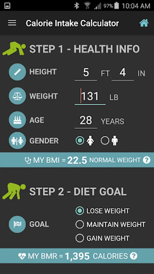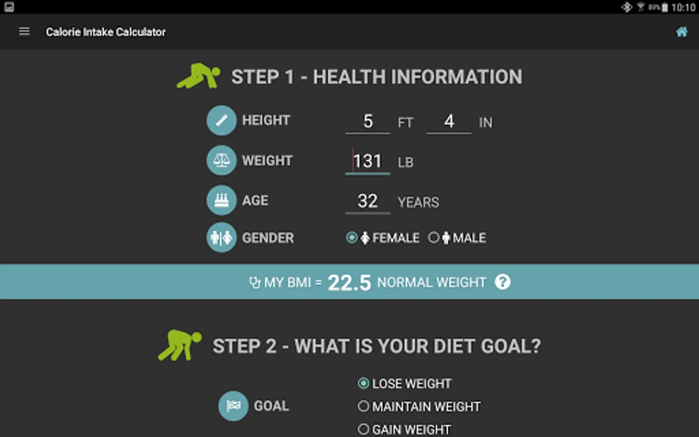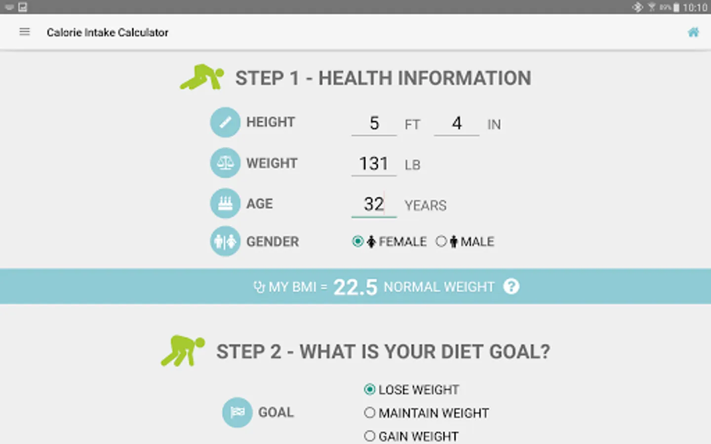 In addition to calculating a daily calorie intake goal, this app also includes the following features: