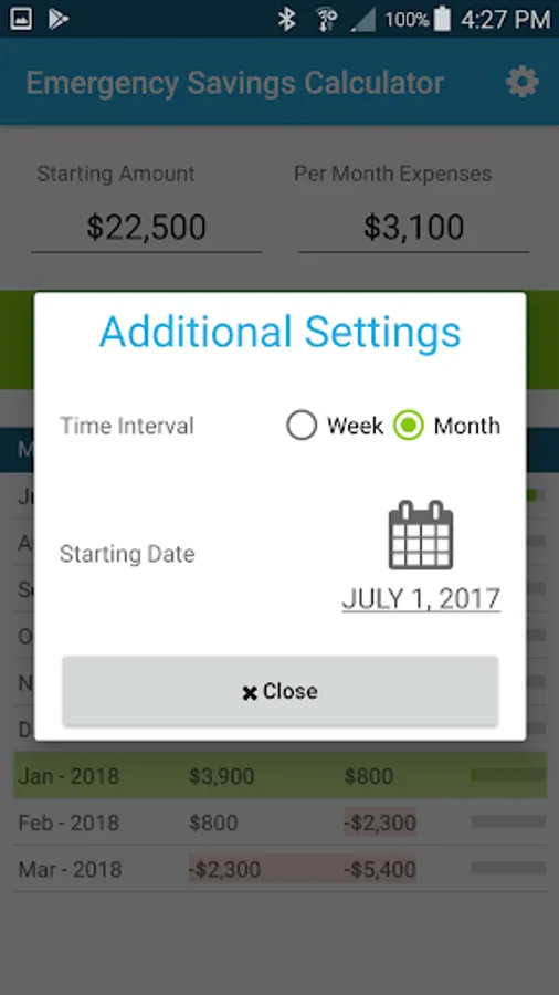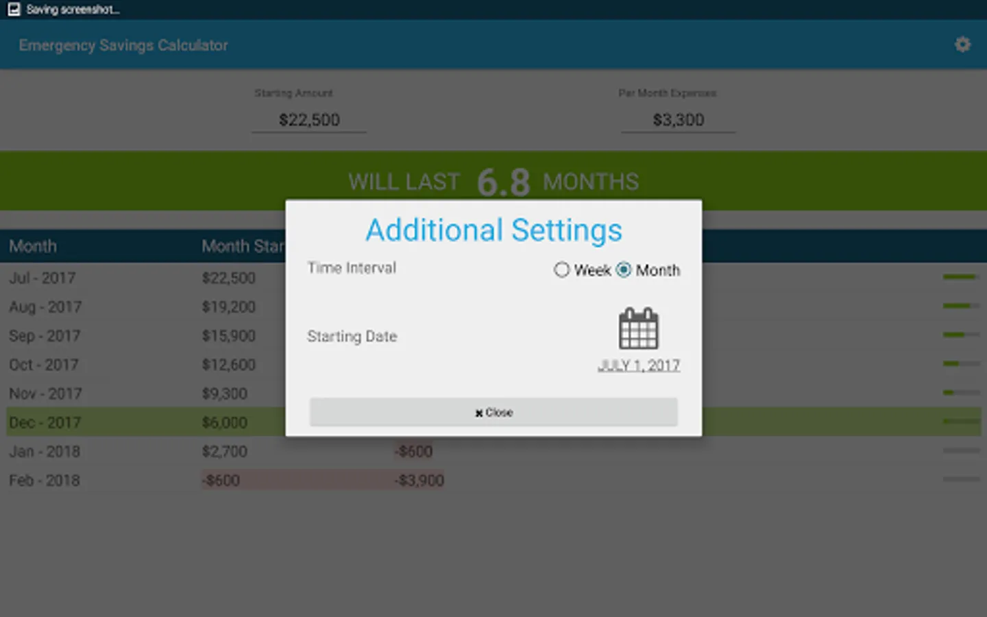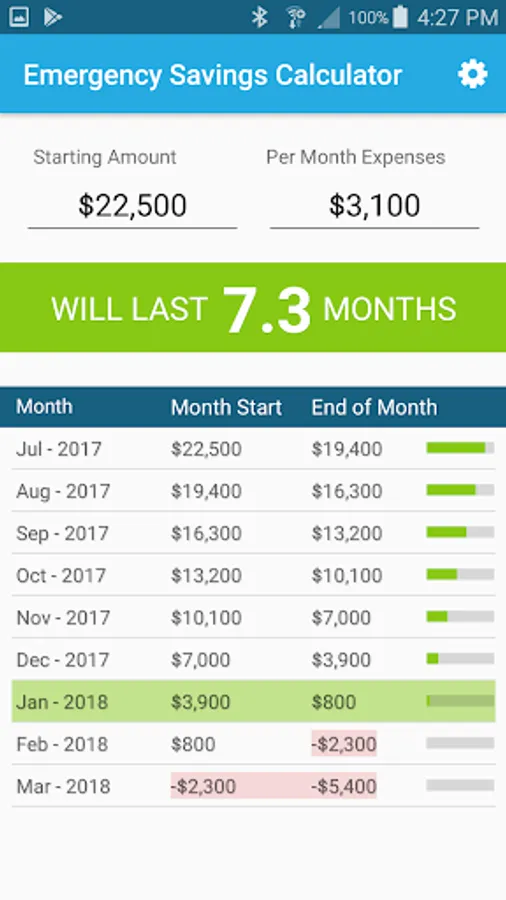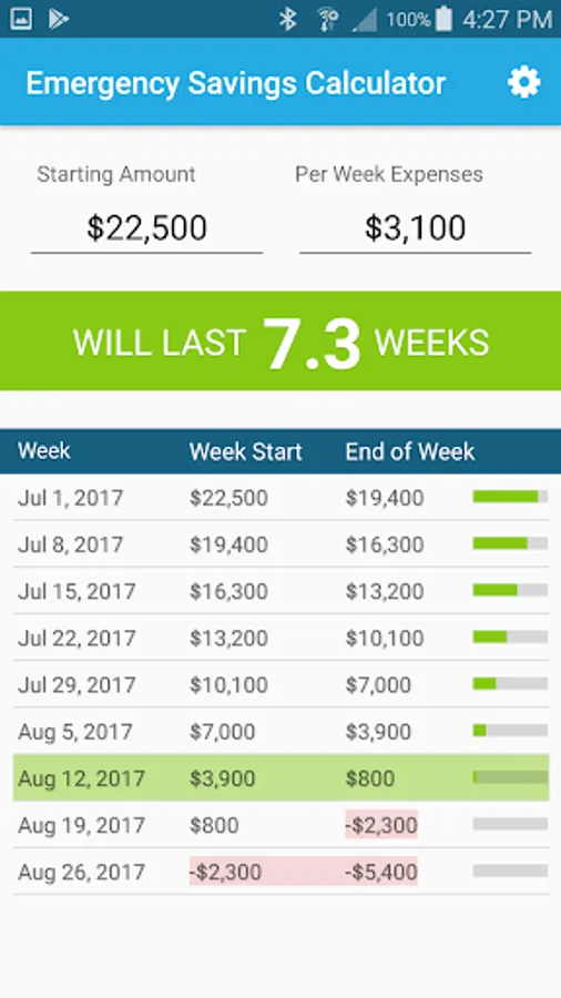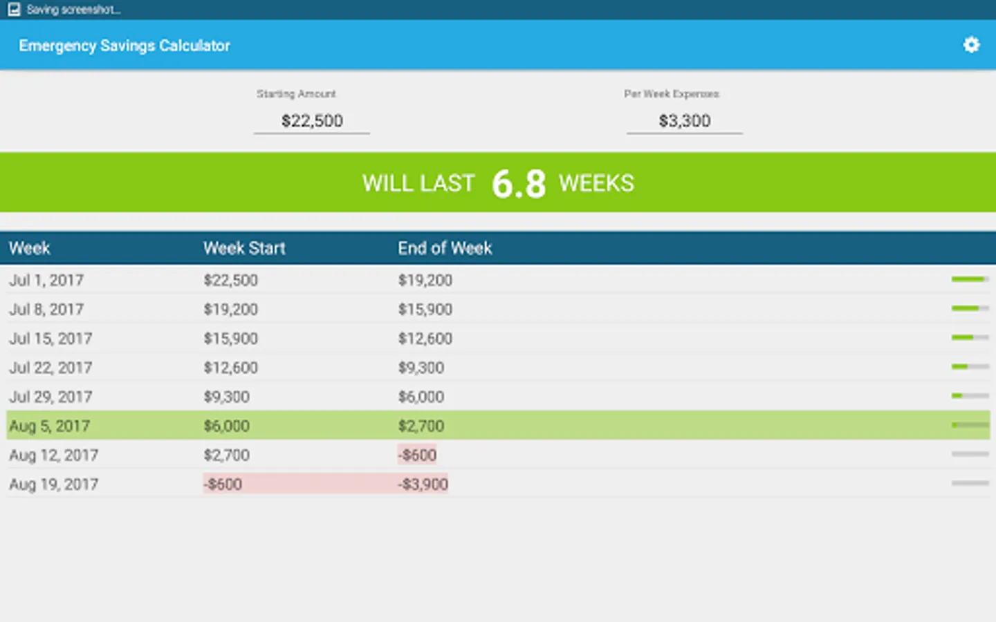Put in your starting amount and then what your expenses would be. The emergency savings calculator does the rest! You will be given a line by line display of what your budget/savings would look like till your money runs out. You can select a starting date and even switch between weeks or months.