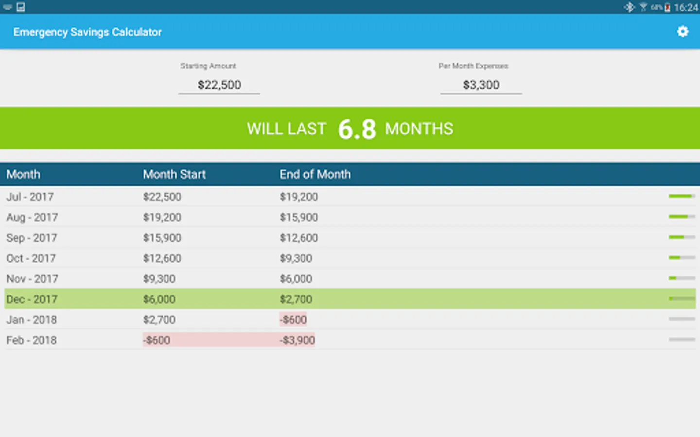 Example: John wants to create an emergency savings budget and wants to know how much of a savings he would need. Most professional money managers will suggest having a savings of at least 6 months. John’s monthly expenses are about 3000 and he has a savings of about 20000. The calculator would then give him a line by line record of how long that money would last.