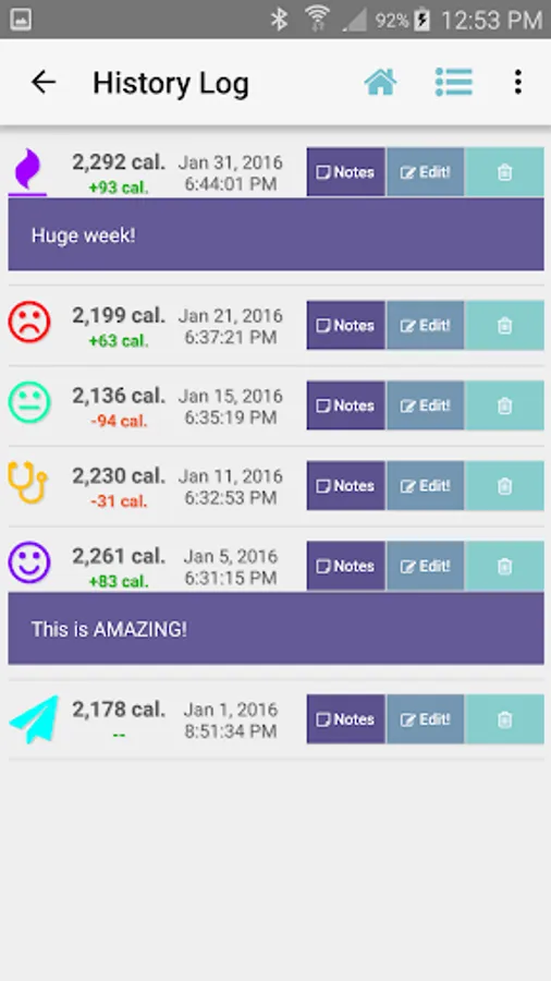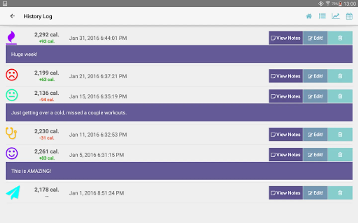 View your past entries in your log as a list, chart or calendar. All results can be EDITED.