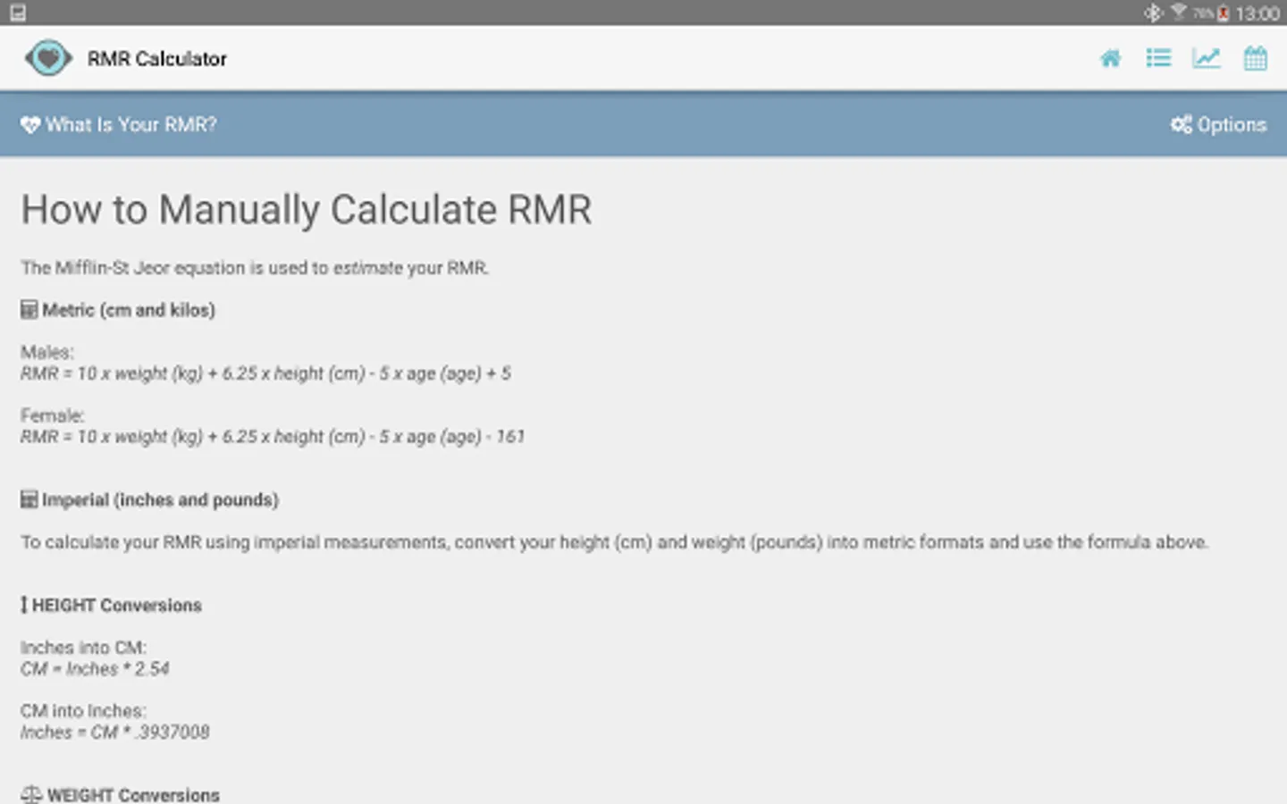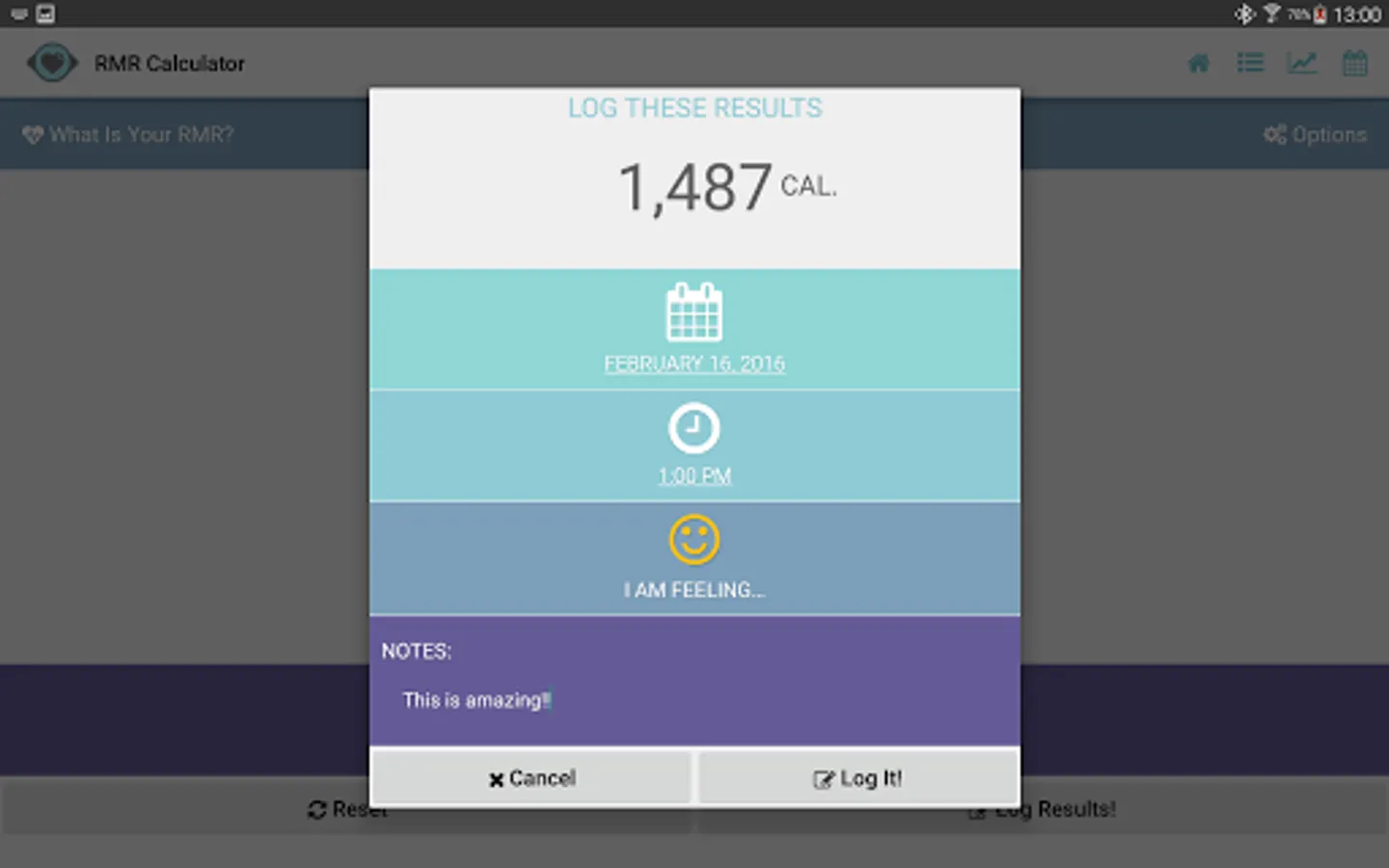This is where the magic of our RMR calculator really shines! View all your past entries in either a list, calendar or chart. You can edit past entries from the list. Our advanced charting control allows you to pinch zoom.