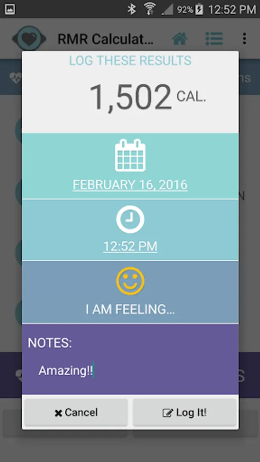 1. Once you have your Resting Metabolic Rate, hit “Log Results!”. This will open up the entry box.