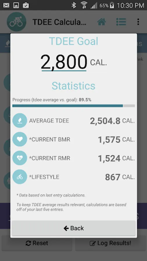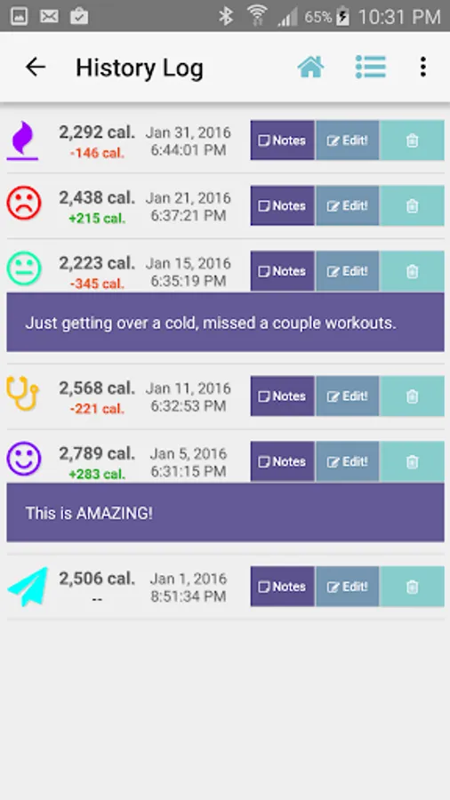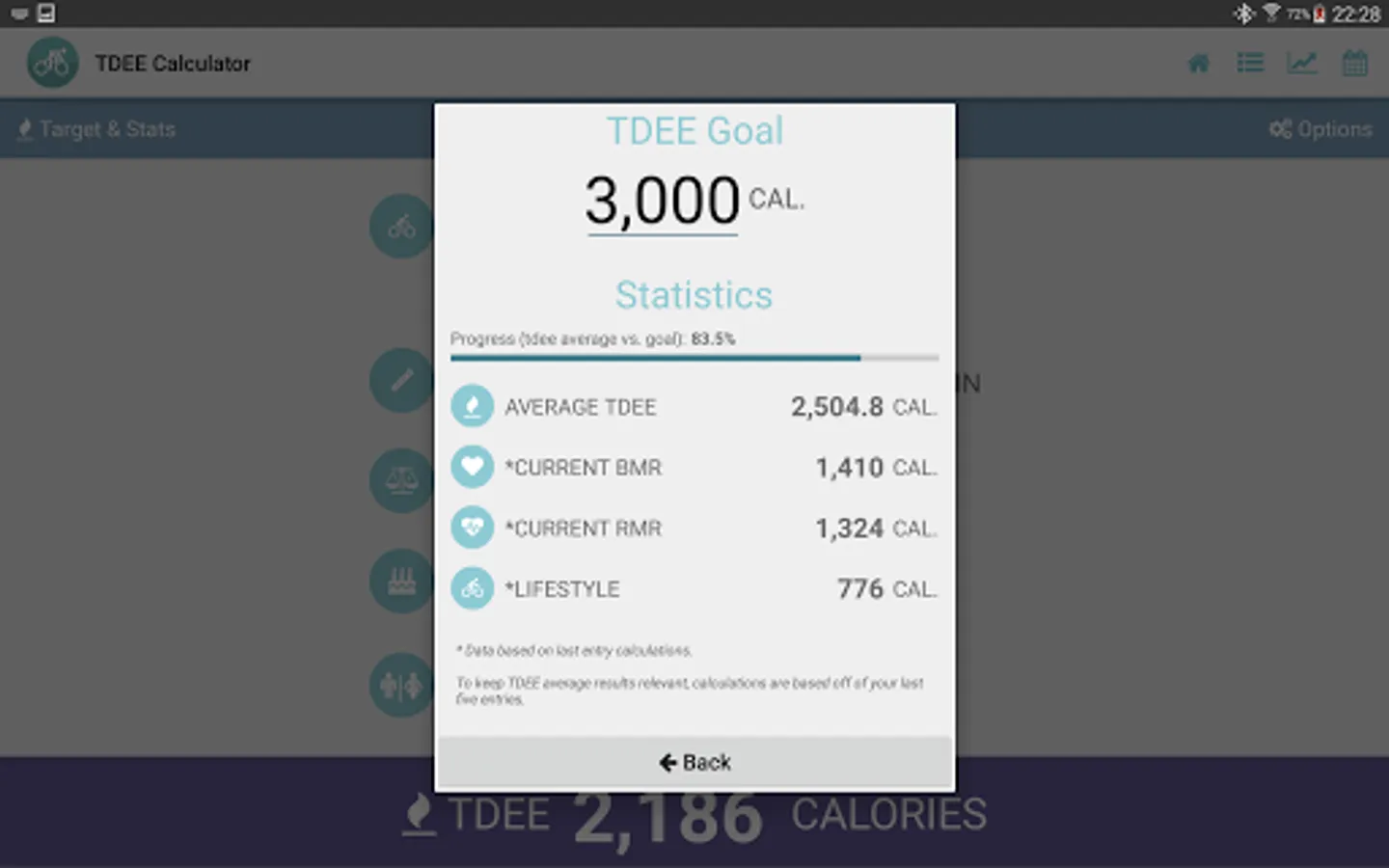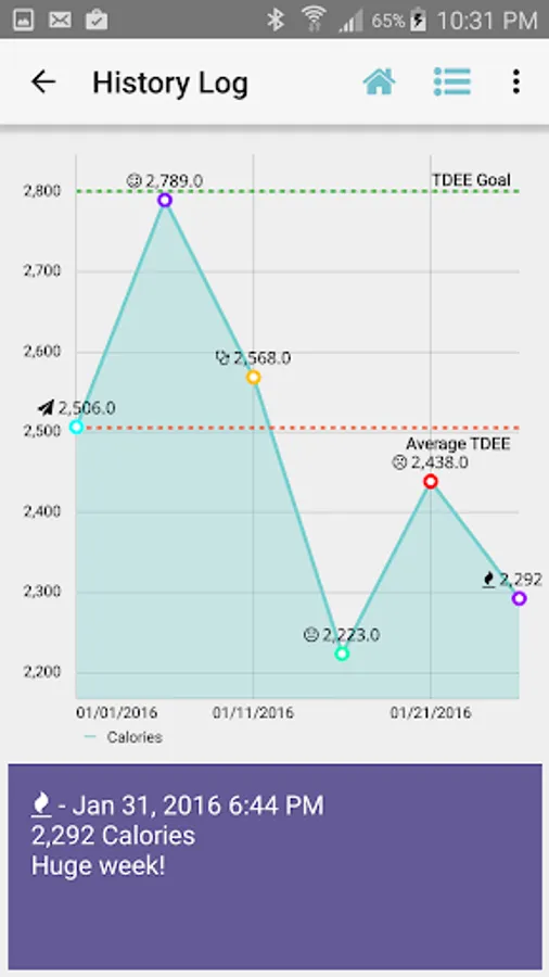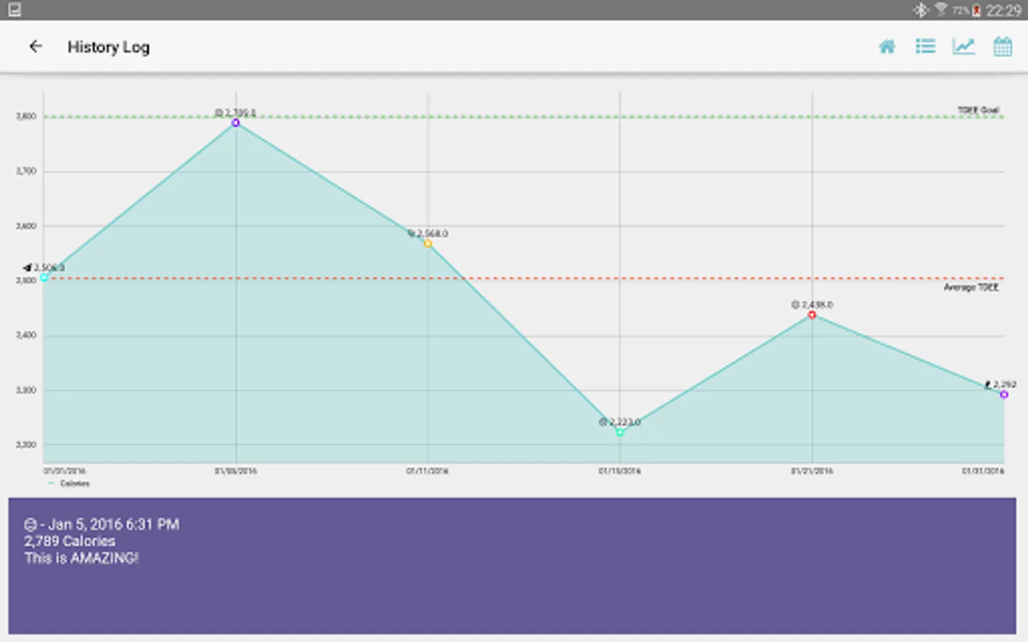 This is where the magic of our TDEE calculator really shines! View all your past entries in either a list, calendar or chart. You can edit past entries from the list. Our advanced charting control allows you to pinch zoom onto results.