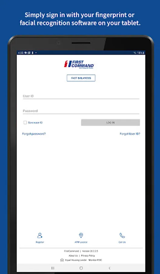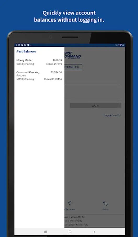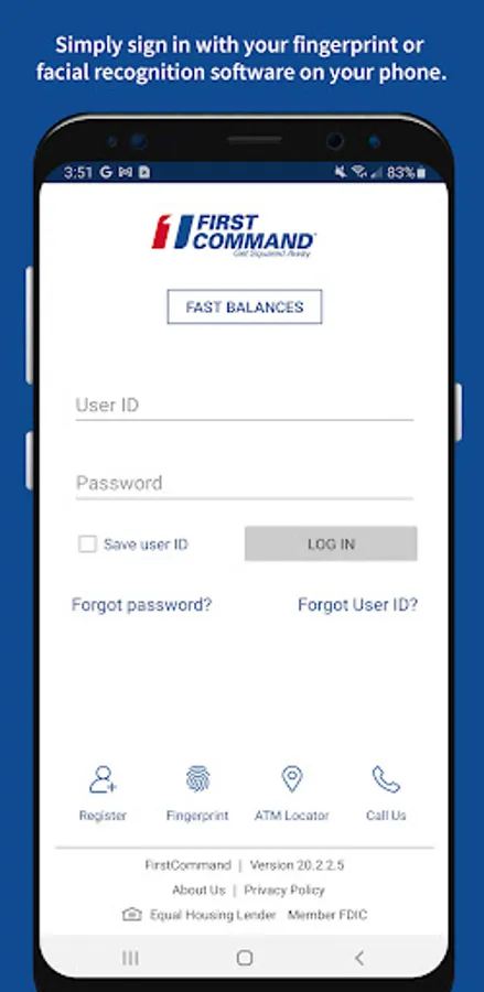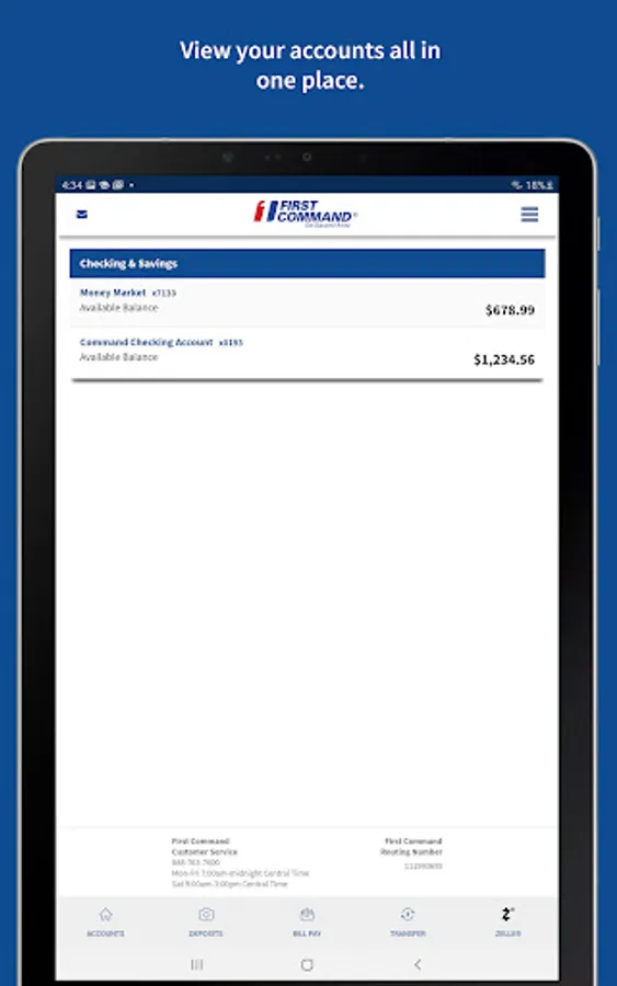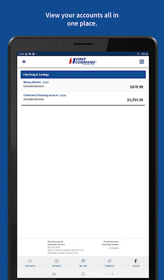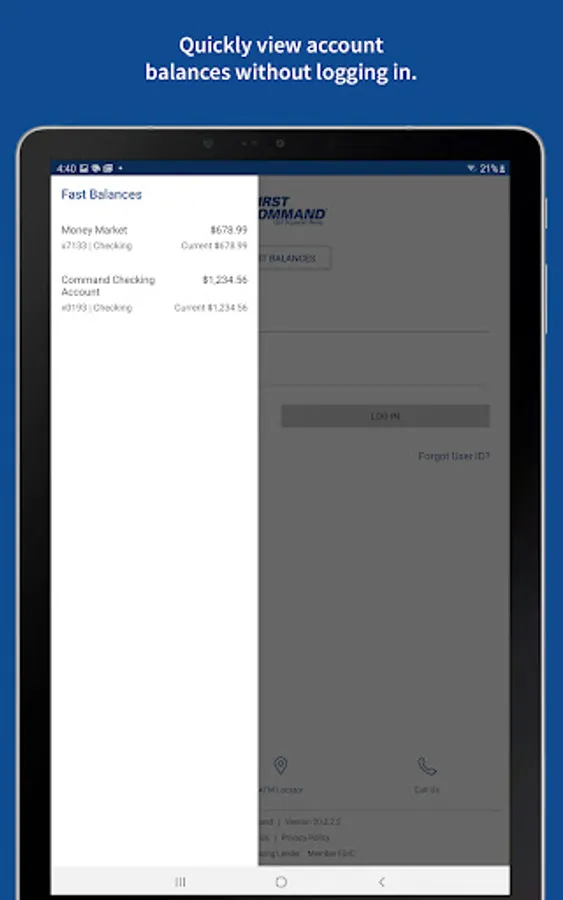To log in to mobile banking, use your First Command username and password. As always, if you have any issues with our app, you can call us at 888.763.7600 or email us at bankinfo@firstcommand.com.