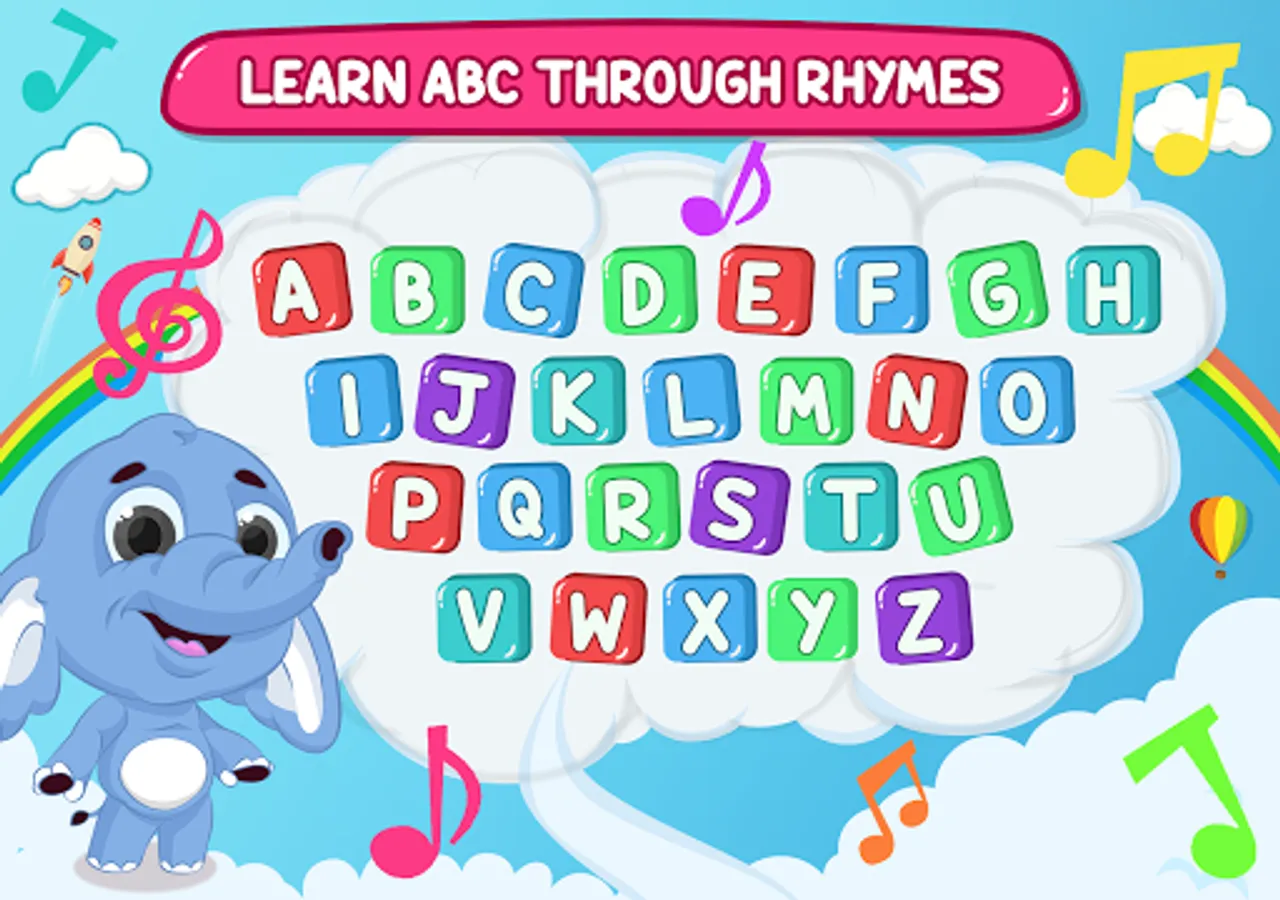 Rhymes – Traditional rhymes around the English Alphabet like ‘Alphabet Song’, ‘A for Apple!’, ‘Phonics Song’ and many more that are fun to sing along and will help toddlers and kids learn the letters from A-Z.