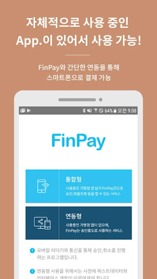FinPay App. is an App. that is provided to solve the inconvenience of having to obtain security certification at the affiliated store. If there is an App. that the affiliated store uses by itself, the App. in use is linked with FinPay with only a simple modification. There is no need to obtain security certification.