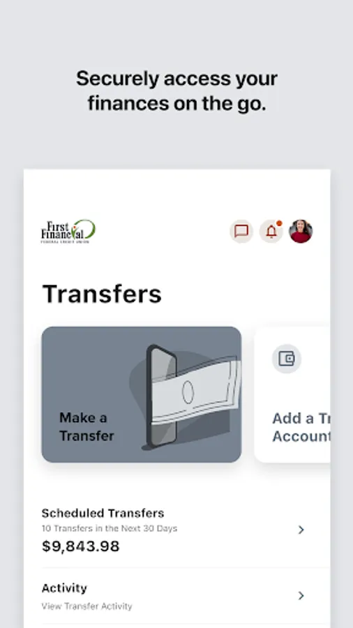 Manage your account on the go quickly and securely with First Financial’s mobile banking app. The new app is easy to navigate so you can get your banking done and then get back to your day!