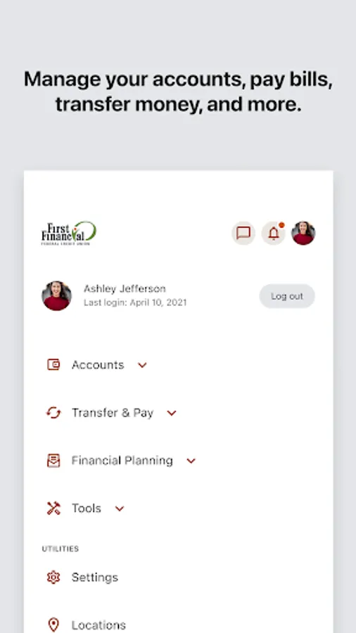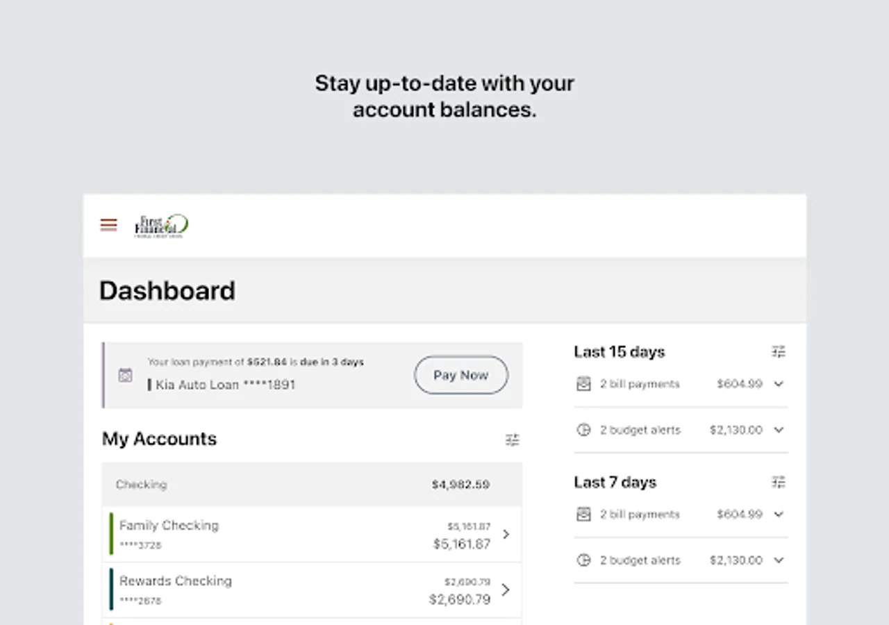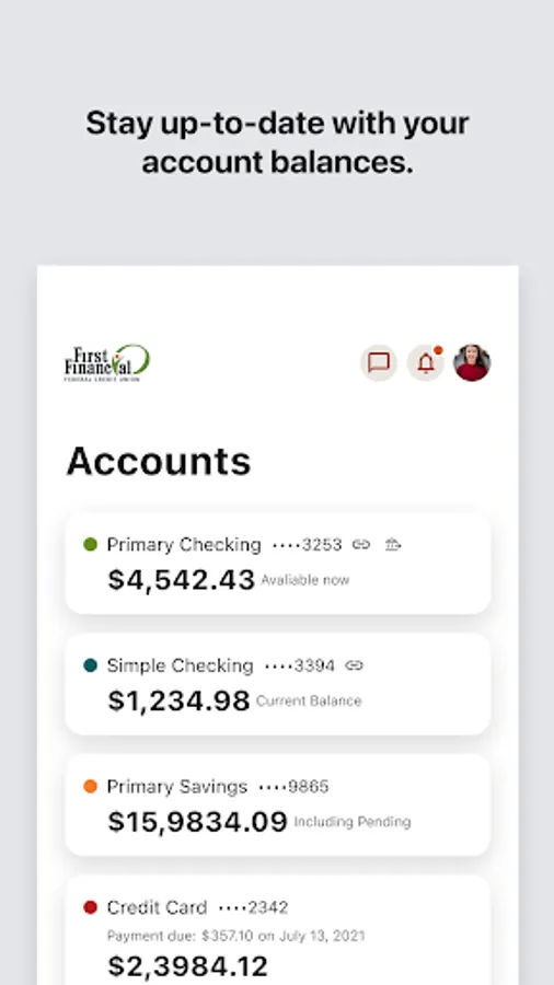• Enjoy shared account access: view other First Financial shares and loans that you are associated with, all with one login.