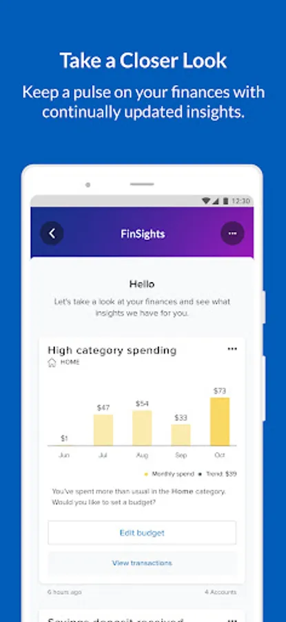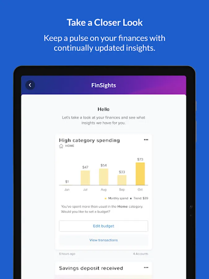 - Receive personalized insights (“FinSights”) across all of your connected