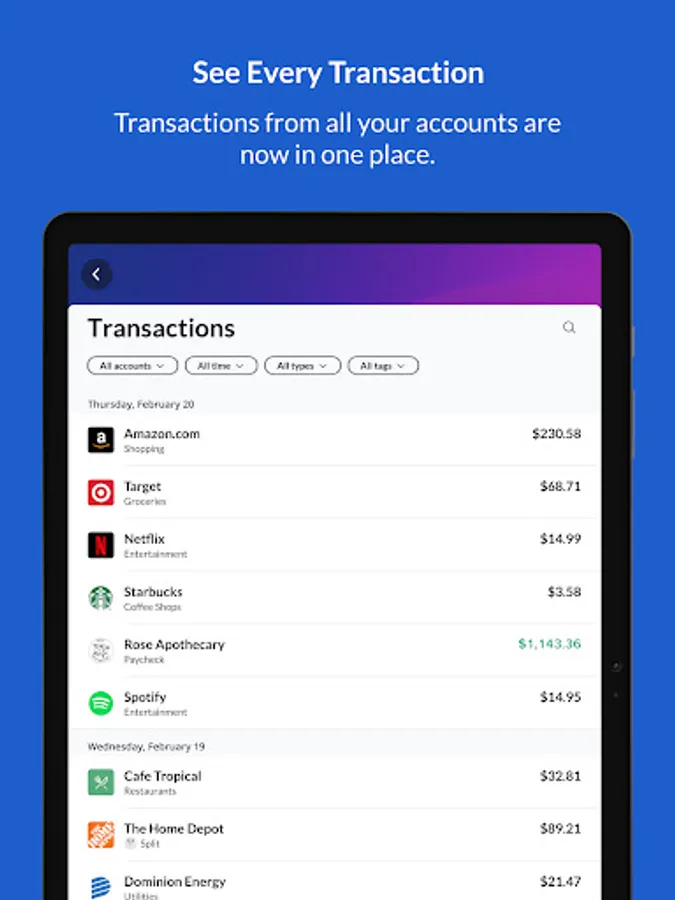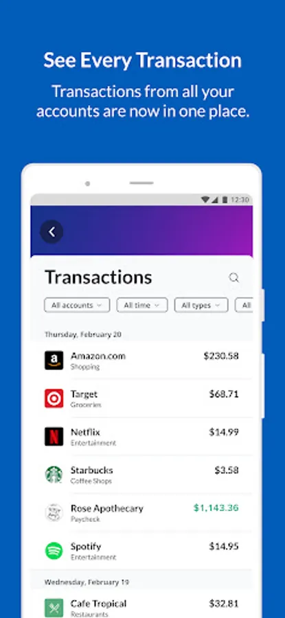 - Review transaction details with merchant logos and clear descriptions, to