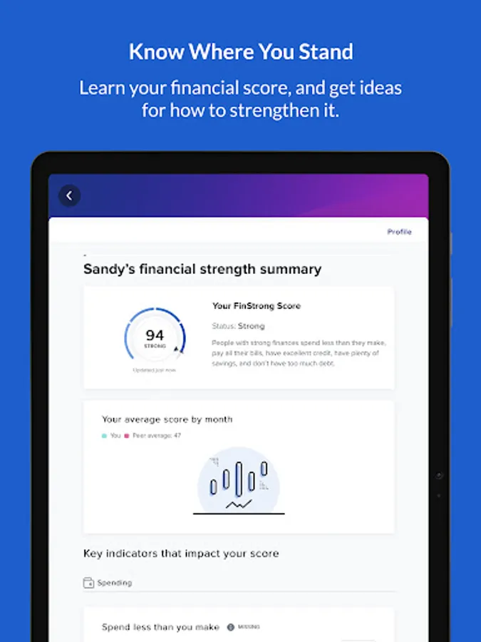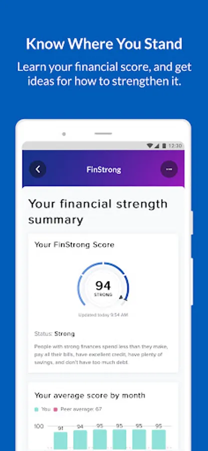 - Track your overall financial health and strength with a “FinStrong” score, and