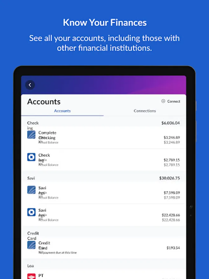 - Connect all of your external accounts to see your complete financial picture.