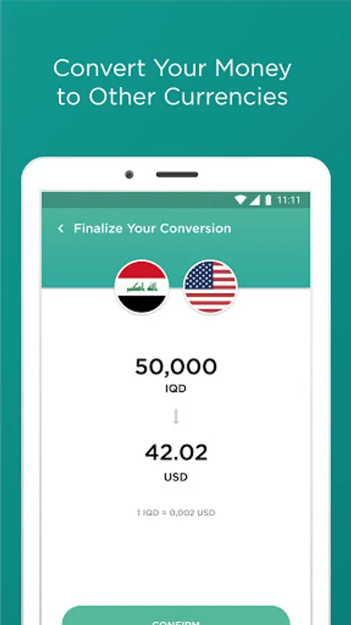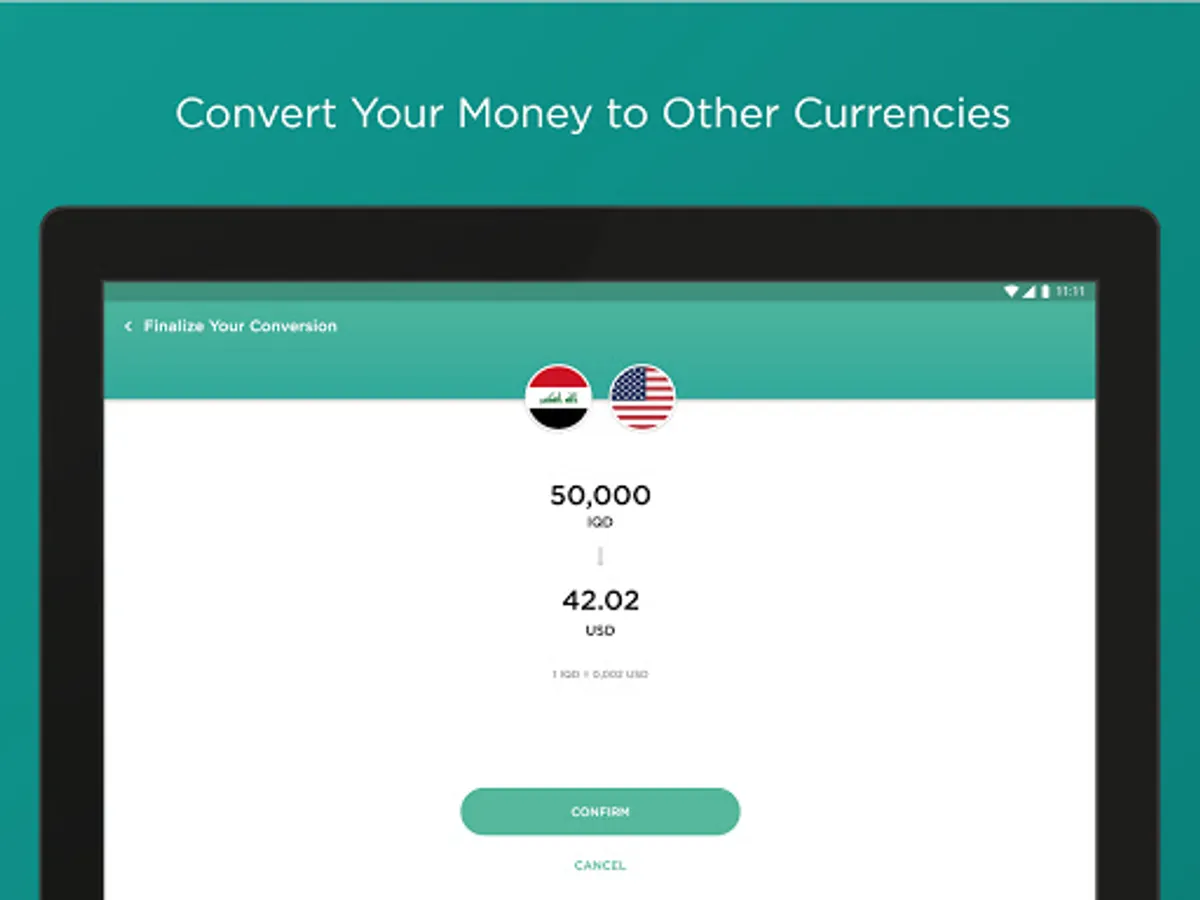 Money conversion. Do you want to store and spend your money in different currencies? With First Iraqi Bank you can easily convert your money between IQD, USD, and EUR.