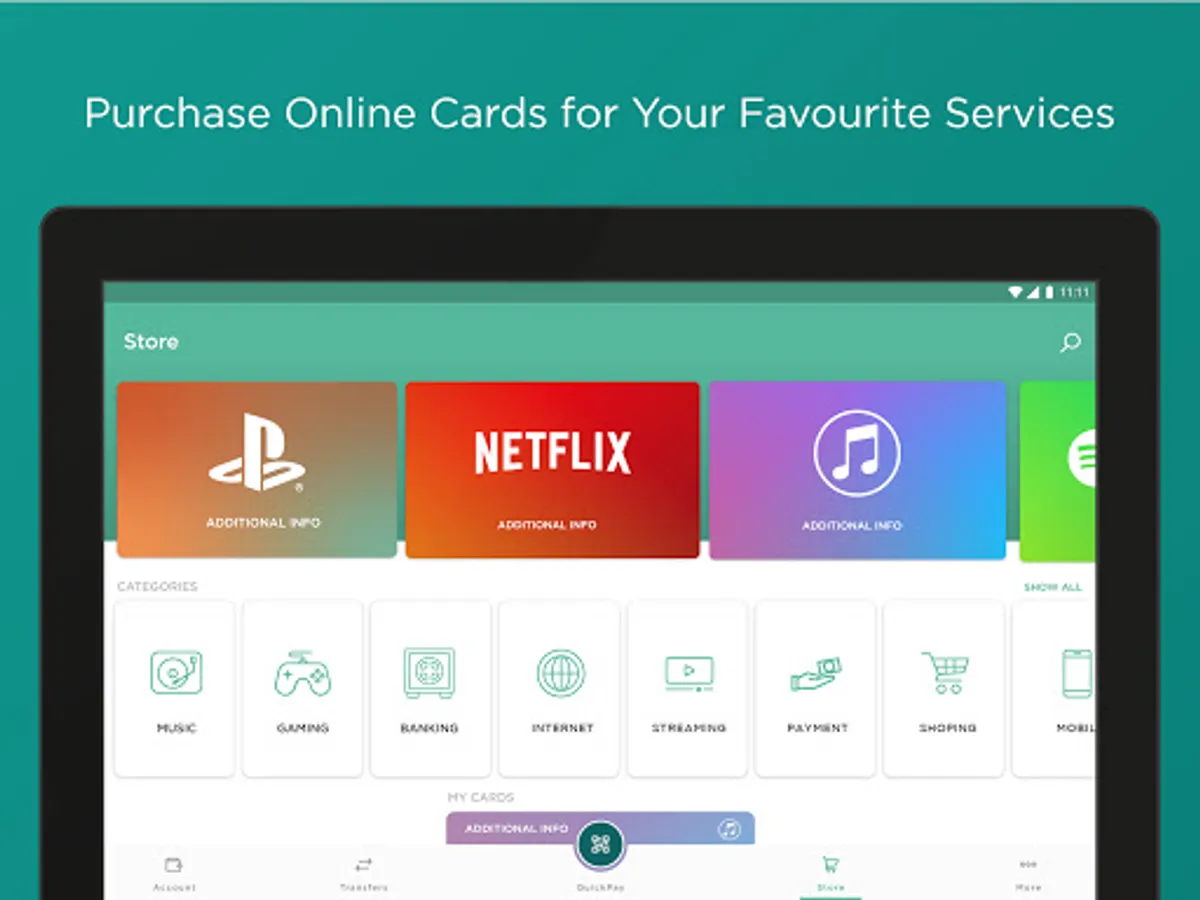 Service Store. With First Iraqi Bank you can quickly purchase vouchers and gift cards from more than 100 different providers (e.g. Careem, Netflix, etc.) using your current balance. They will appear in the app’s wallet after the purchase, from where you can also share them with your friends and family.