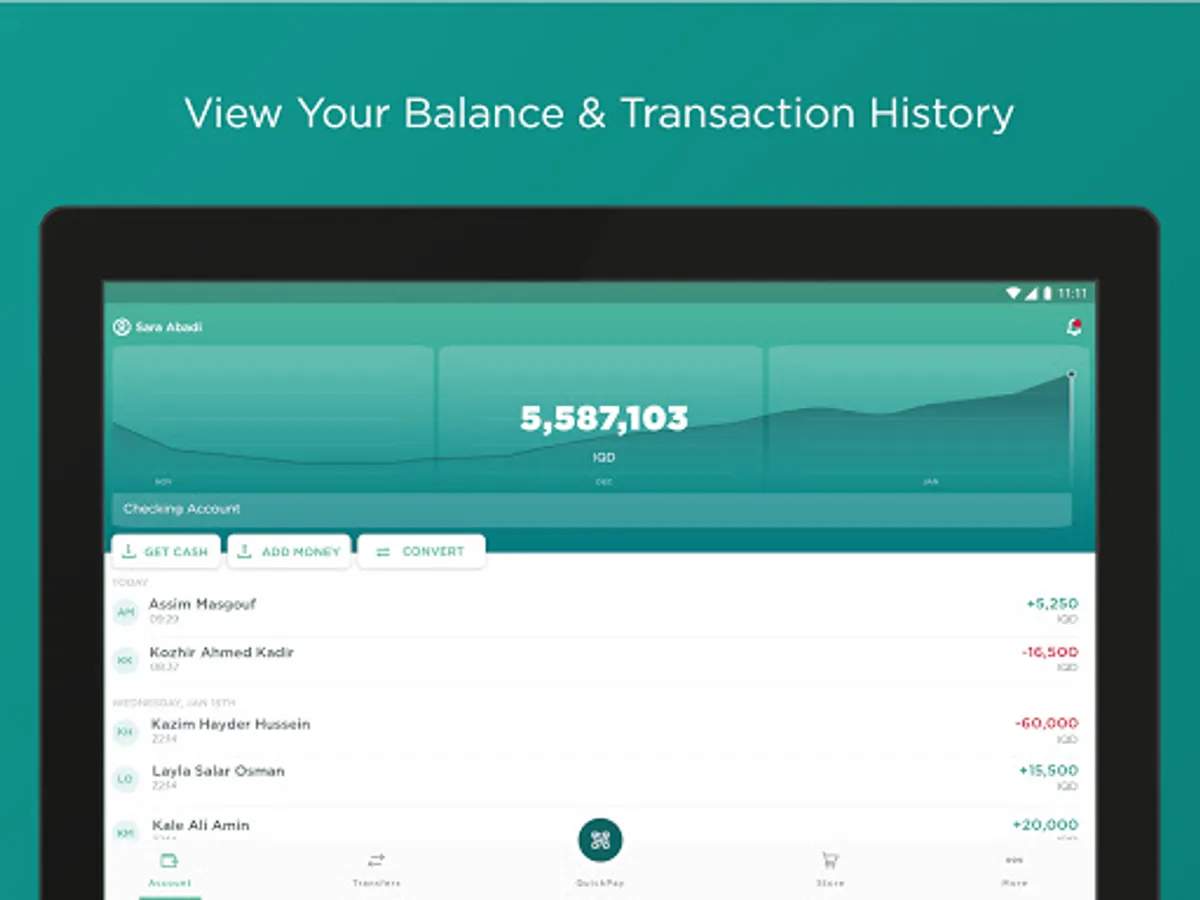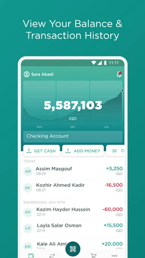 Withdrawal. Quickly and conveniently withdraw cash using a wide network of merchants all around Iraq. You can do this by simply scanning a QR code provided by the merchant. Your balance will be updated instantaneously.