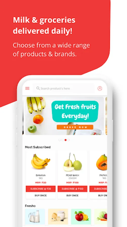 With FirstMeal, you can fulfill all your daily needs (fruits, vegetables, milk, bread, eggs, yogurts & grocery) from an assortment of more than 1,000 branded products in the most hassle-free manner. You can choose from over varieties of milk (fresh, tetra pack, cow, buffalo, organic, etc)