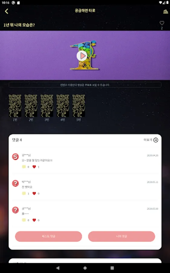 -Make your wishes of the day through the tarot. Even if you make a wish, free points will be earned, and even if you support (comment) someone else's wishes, you will earn free points.