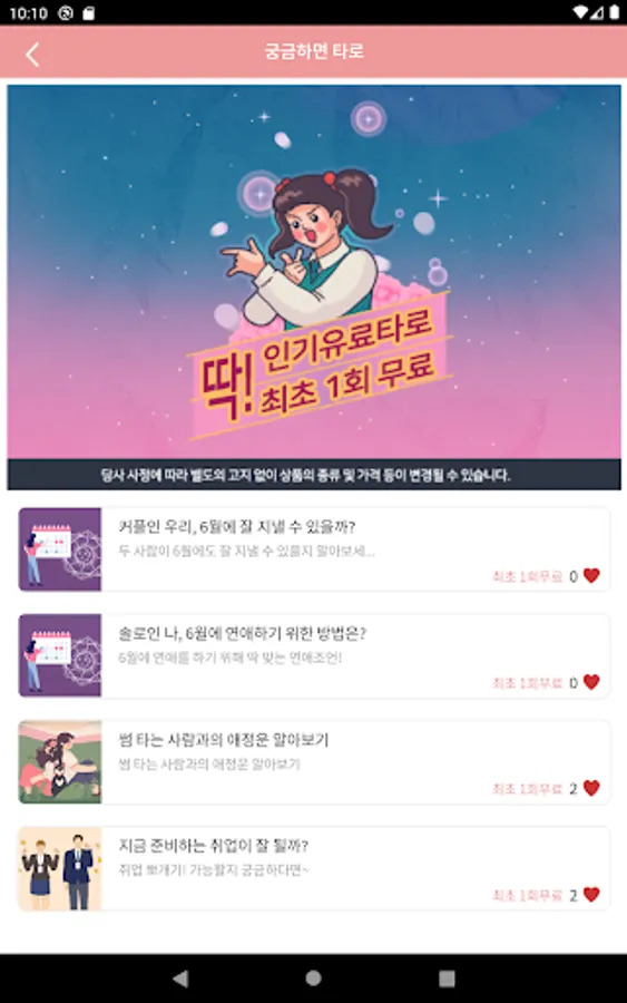 A. Yes, there are a variety of free tarot contents such as today's tarot and today's wish card, as well as monthly affection and wealth. In addition, Tarot Cards, which can be used for a 30% discount, are also abundant, so you can enjoy Tarot Cards freely.