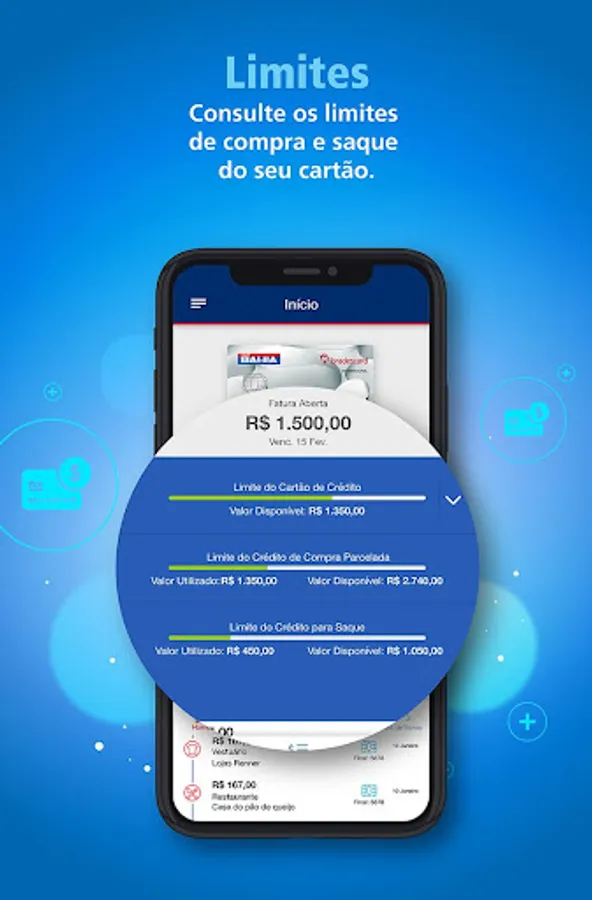 - Consultation of limits on cash purchases, installments and withdrawals;