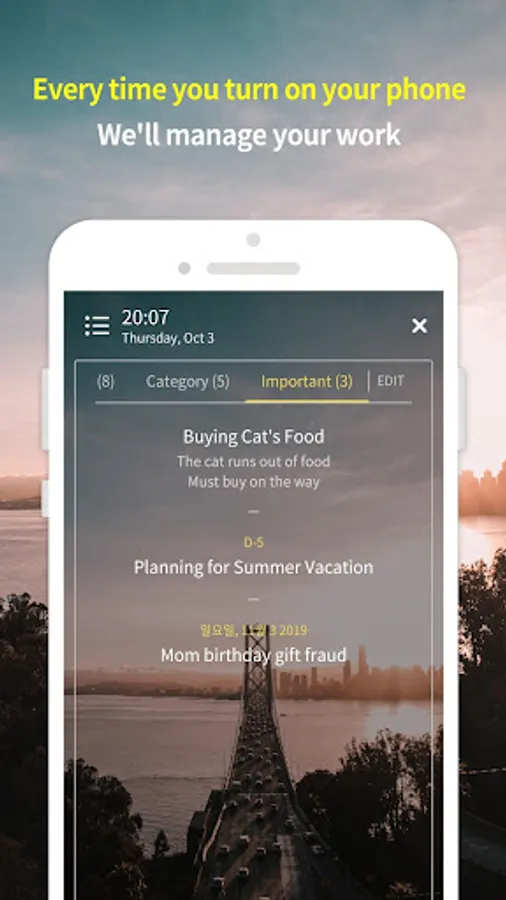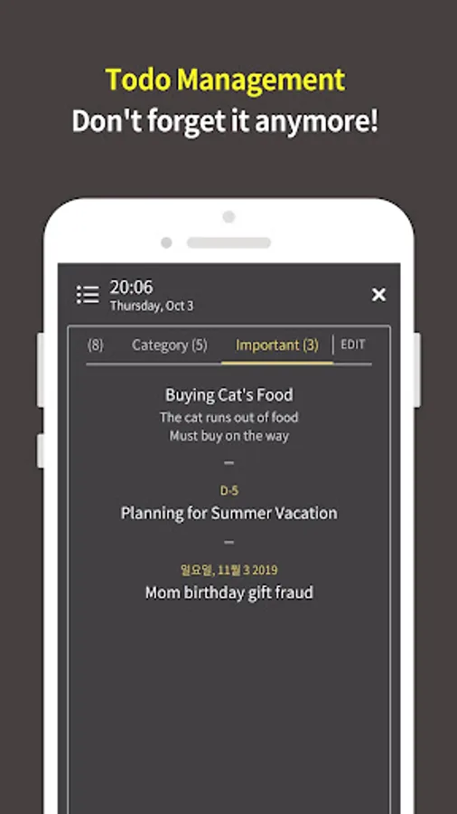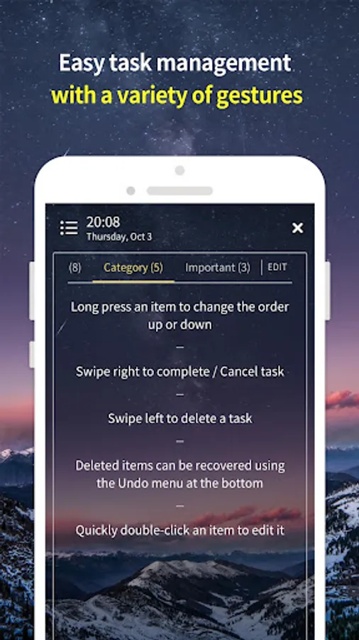 - Manage Todo list easily from the first screen (You can easily manage your To do list with many gestures)