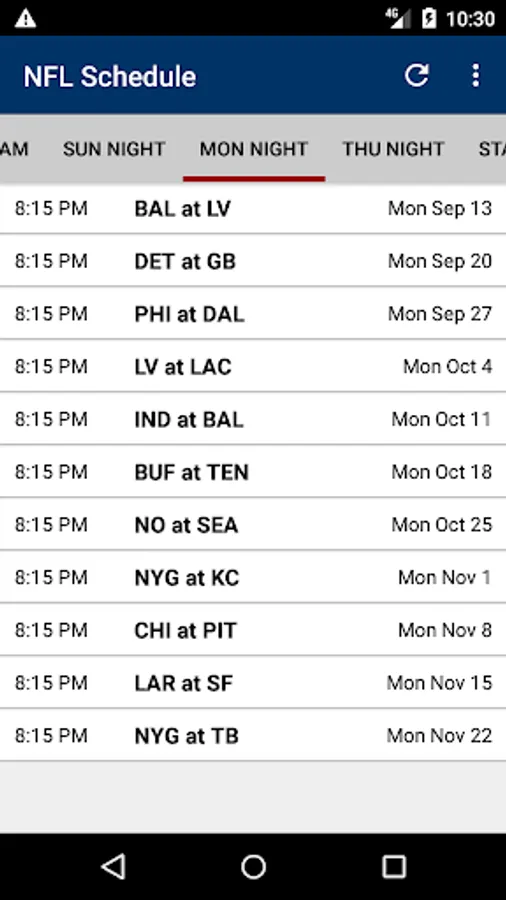 Easily browse through games week-by-week, or pick out your favorite NFL team's schedule or choose from Monday night football (MNF), Sunday night (SNF) or Thursday night (TNF) match-ups.