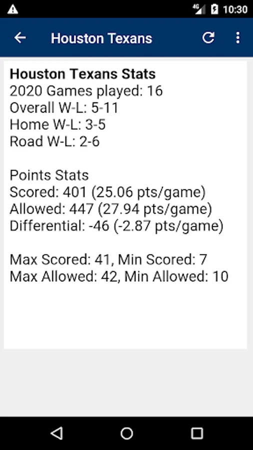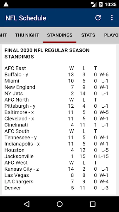 The stats section lists passing, rushing and receiving leaders - great for fantasy players. Quickly browse home team records, lopsided wins, shutouts and most points scored in a game this year. And team stats are included, plus more!