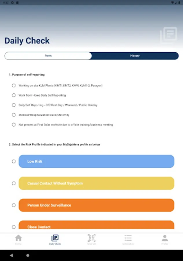 FirstSolar iCare usage is only for FirstSolar Malaysia Sdn. Bhd. workforce (employees, contractors and visitors) to provide updates on work locations (work from home, work on site) to enable the Company to take appropriate and timely actions to protect its workforce.