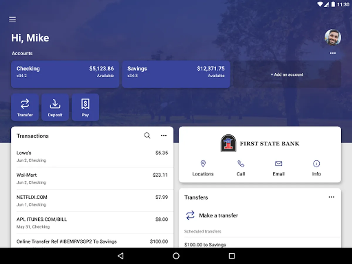 Contact: Locate ATMs or branches and contact First State Bank customer service directly from the app.