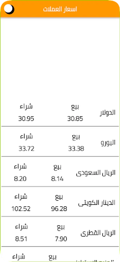 يقدم التطبيق جميع اسعار العملات الرسمية واسعار مواد البناء واسعار الذهب والخضروات والفواكه والتغيرات فى الاسعار لحظة بلحظة سوف يفيدك التطبيق لمعرفةالتغيرات فى الاسعار لحظيا