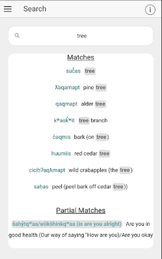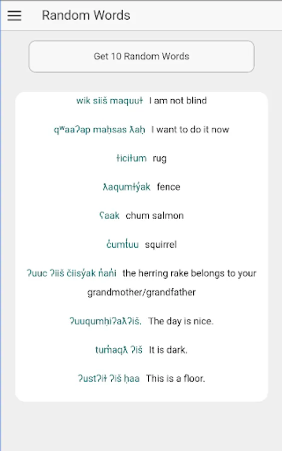 The Ehattesaht language app is a media-rich bilingual dictionary and phrase collection comprised of words and phrases archived at the online Aboriginal language database FirstVoices.com. Word and phrase definitions are illustrated with audio recordings, and images. Users can generate their own thematically organized flashcards and bookmark words or sentences to create their own lists.