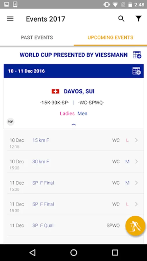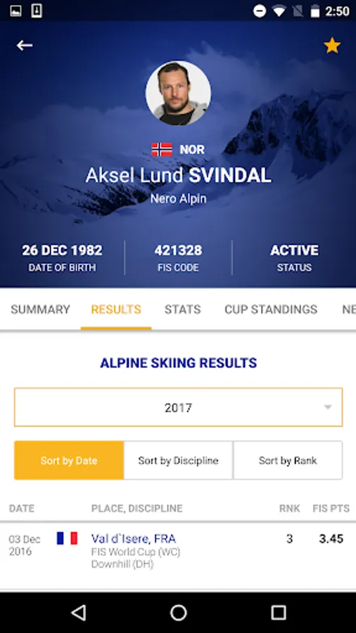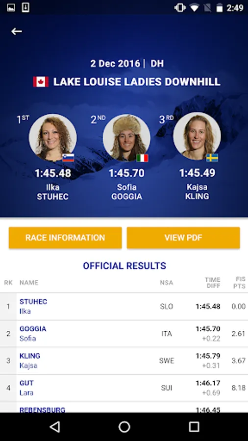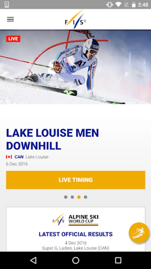 The Official FIS App gives skiing and snowboarding fans one stop shopping to follow all FIS events. Complete live timing and results, highlight videos all news, photo galleries, and much more. For every fan of skiing and snowboarding the best source of up-to-the minute information on events from the World Cup, World Championships, Continental Cup and Junior events.
