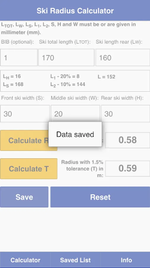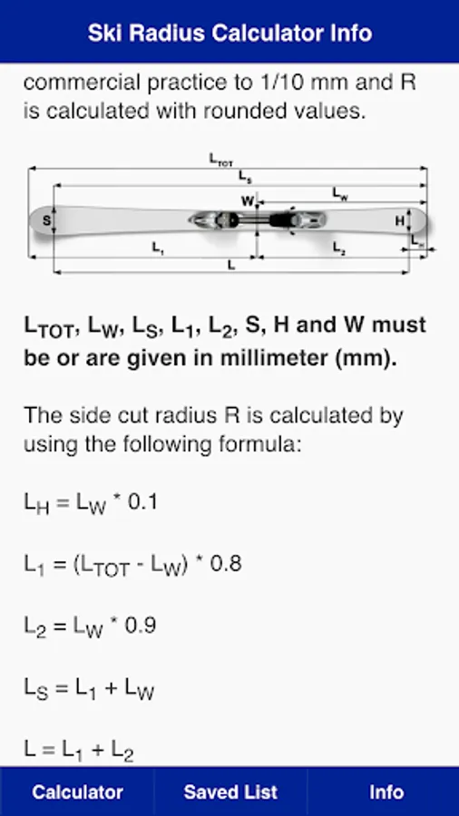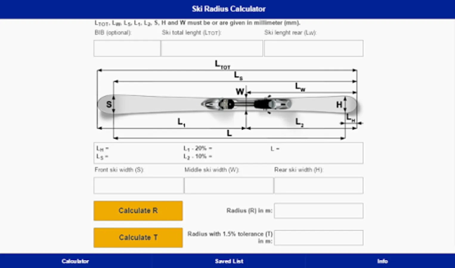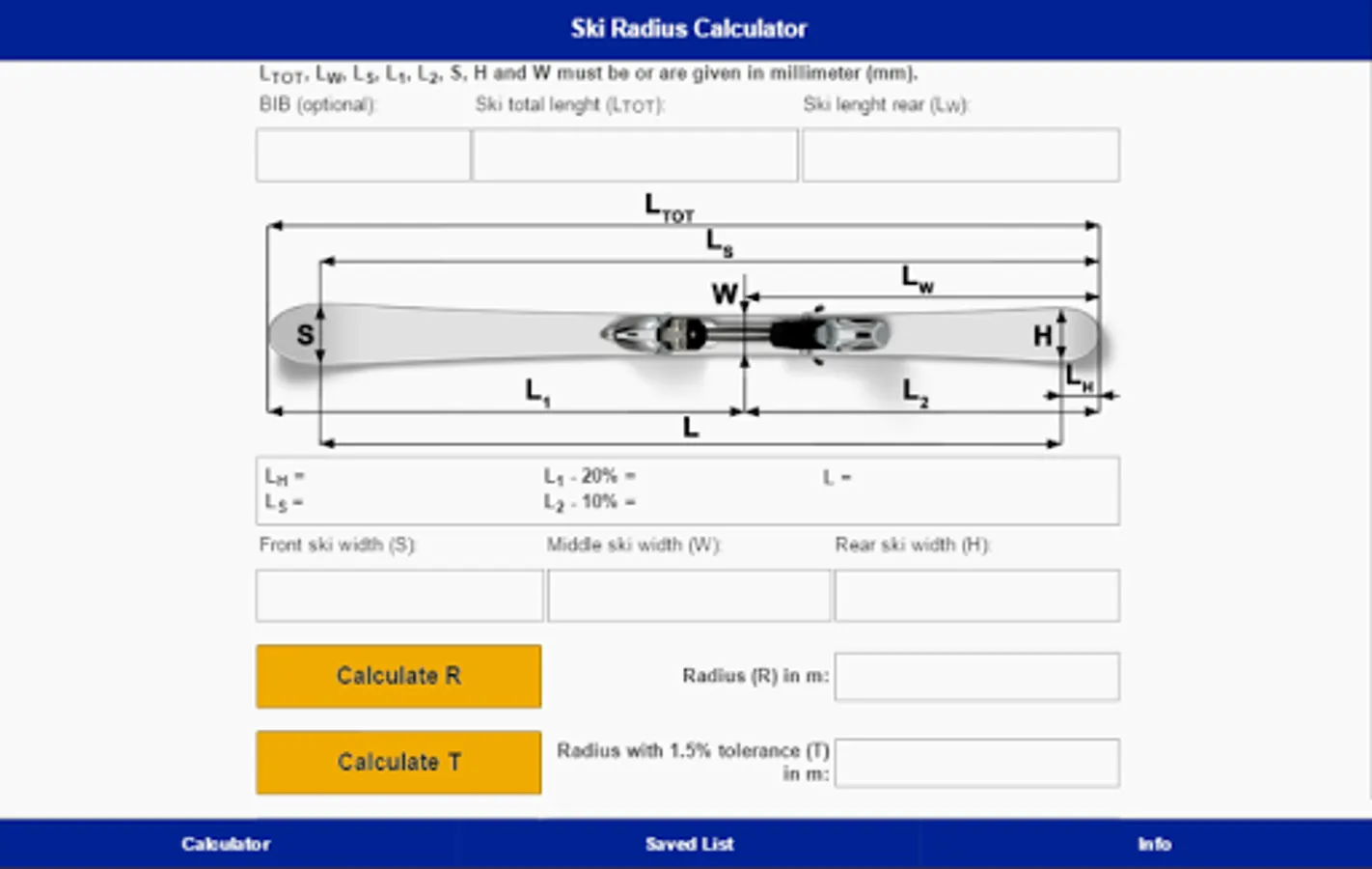 Official FIS Ski Radius Calculator used to determinate ski length and side cut radius allowance according to the FIS rules; using ski total length, rear length, front width, middle width and rear width. The Radius is calculated in meters and can be also calculated with 1.5% tolerance. Once the value is calculated, it can be saved and afterwards emailed to your personal account. There is an information section where parameters and formula are explained.