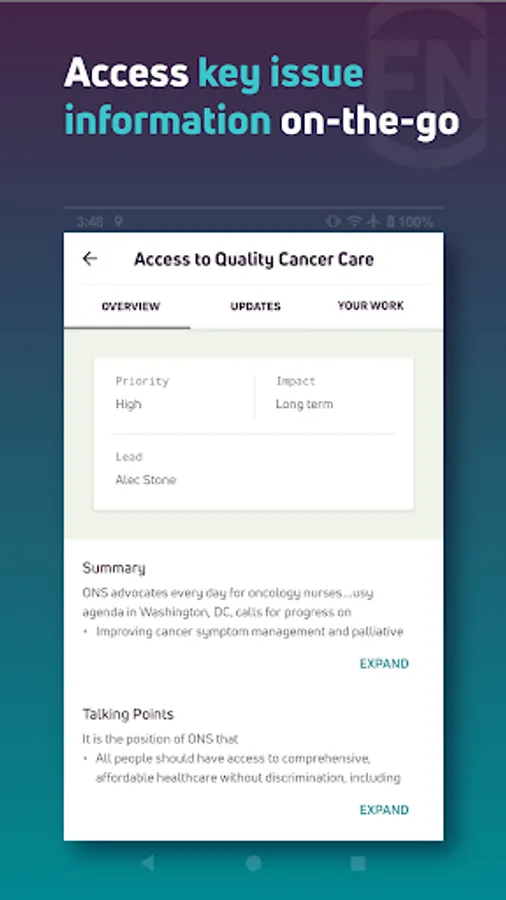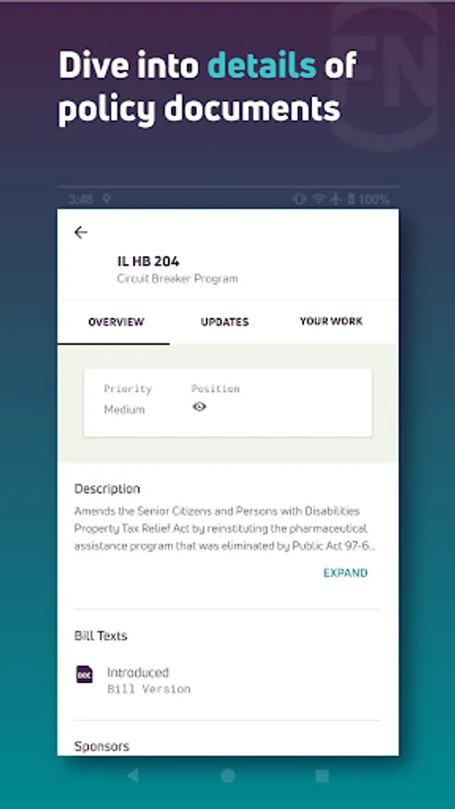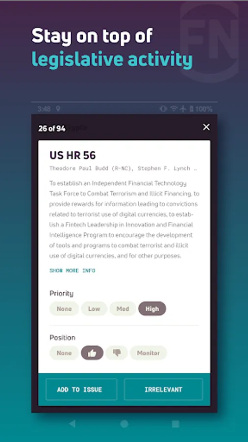 FiscalNote for Android puts the power of FiscalNote in the palm of your hand. Get updates in real time, manage policy documents, and keep track of stakeholders wherever you are. With your issues and bills on-hand, the app keeps you informed, connected, and prepared to make the right decision for your organization.