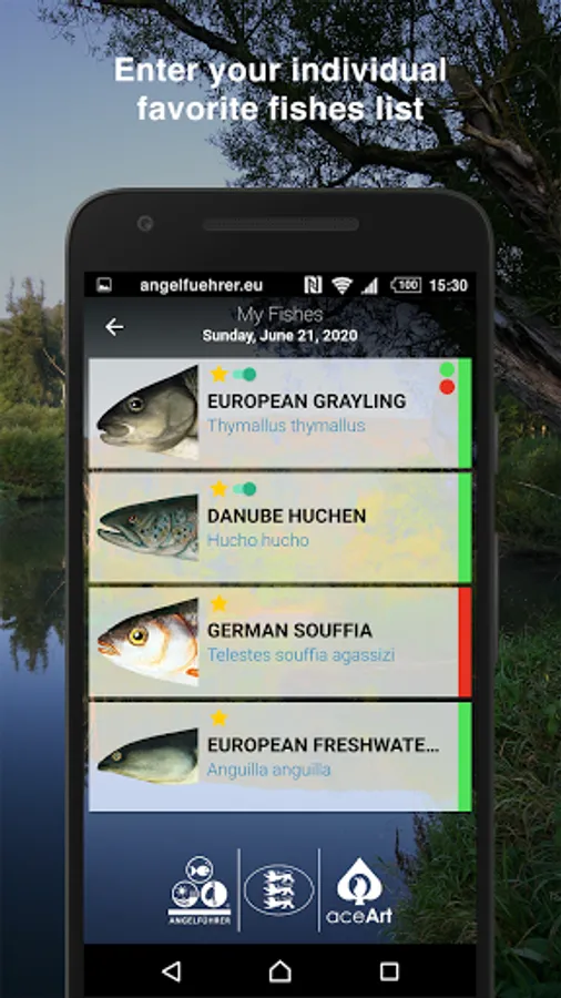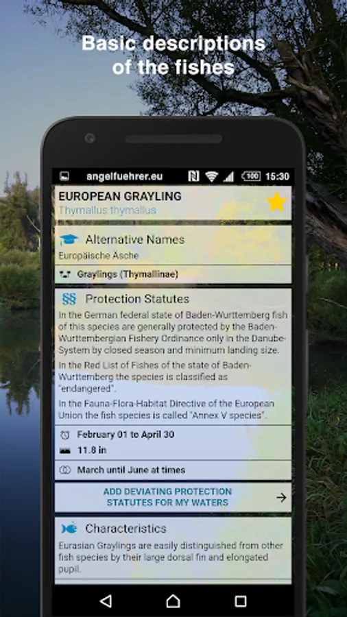 Each fisherman can additionally and individually enter and compile the relevant closed seasons, protection measures as well as catch limits of his target fish. Especially for the waters of own choice, own club, own home water...