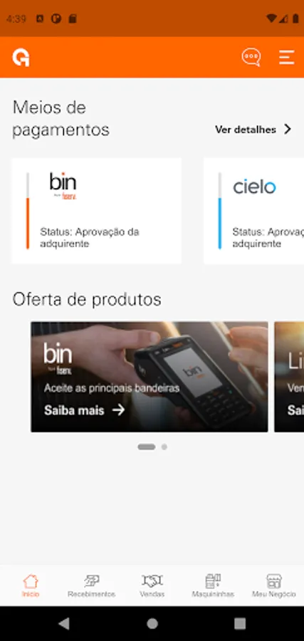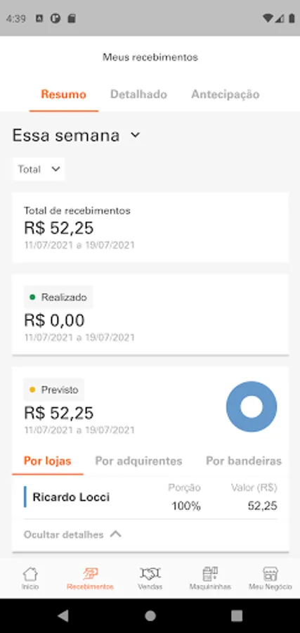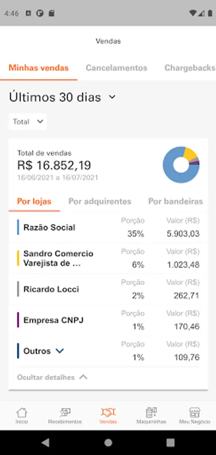 Here you will see your sales made in each of your acquirers and machines, how much was paid by your customer in debit, credit and installments.