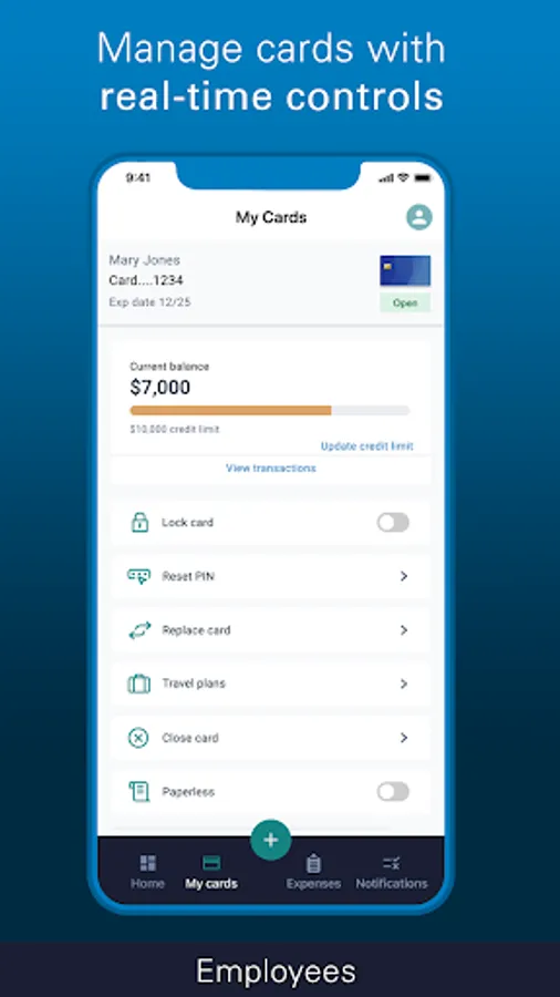 -- Small-business owners and managers to view employee accounts, open new accounts, manage credit lines, and view and approve expense reports
