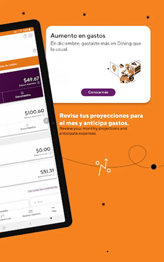 ∙ Proyecciones Mensuales: Obtén predicciones de tus transacciones y saldos para anticiparte a tus gastos y mantenerte en control de tus finanzas.