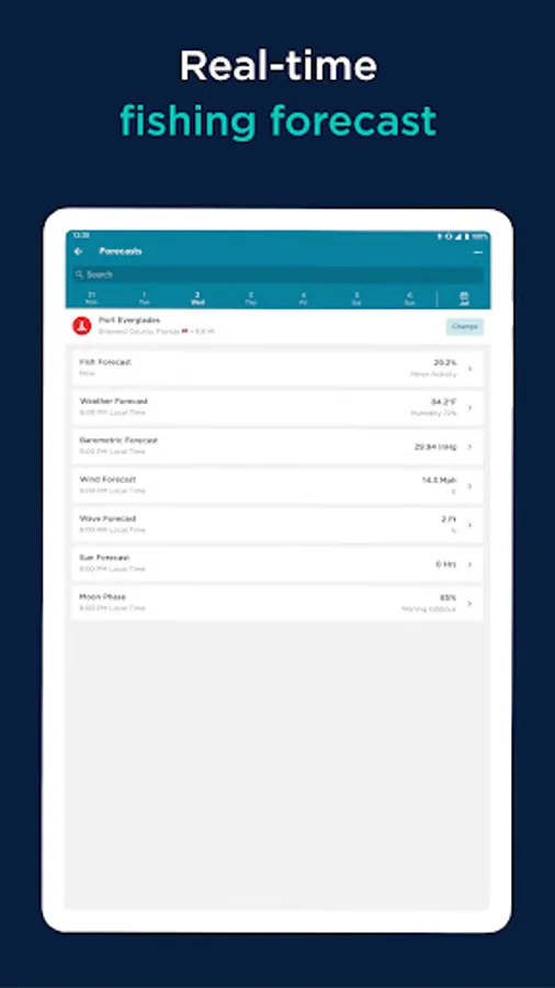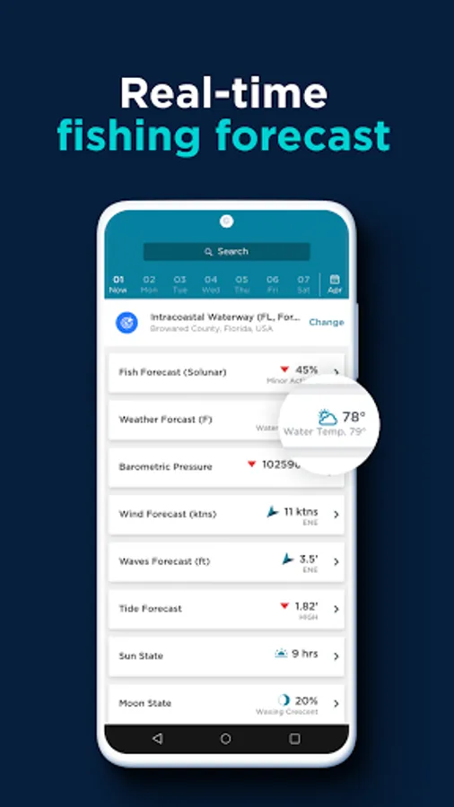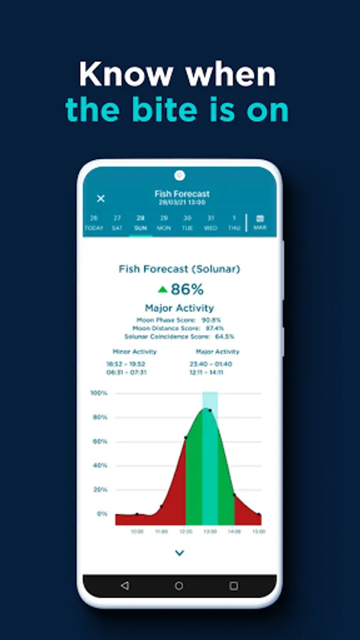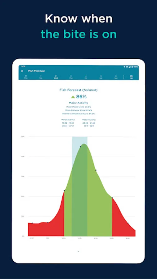 • Know when the fish are active & ready to bite based on the Solunar fishing forecast