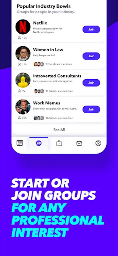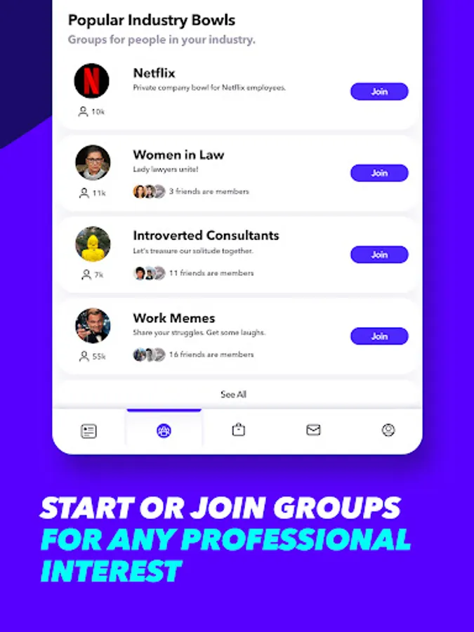 Choose from thousands of Industry, Community or Company Bowls ("Groups") and have genuine conversations with other verified professionals that are working in roles and industries similar to your own.