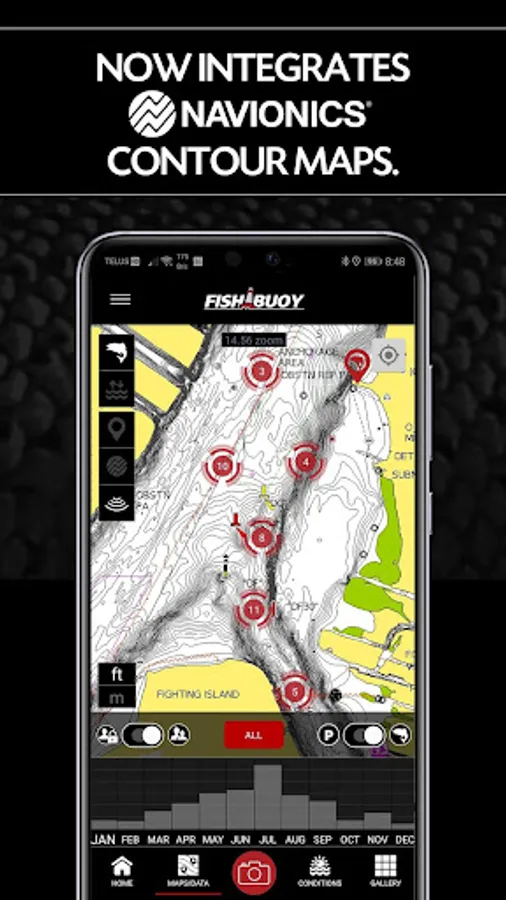Beyond FISHMAPS, we've integrated the world's most popular lake contouring software - NAVIONICS. Now you can see your fish catches over contour maps or plan locations before you head out onto the water. Simply use your existing NAVIONICS App login credentials.