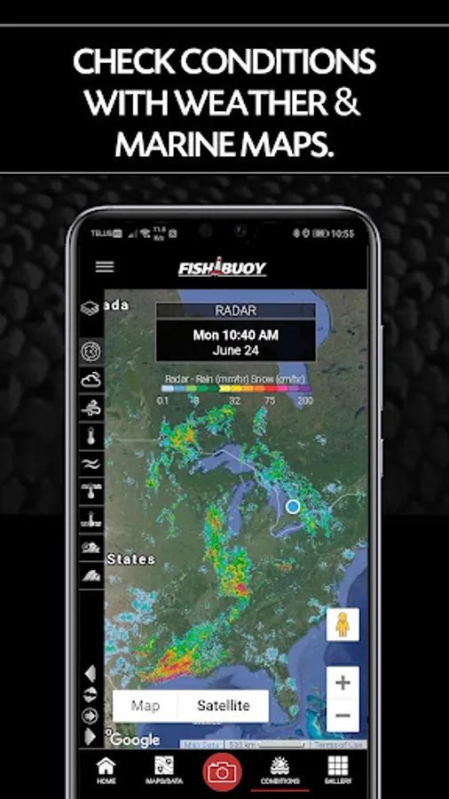 FISHBUOY Pro connects anglers to weather maps that include Doppler radar, wind speed and direction, air temperatures, Great Lakes surface/bottom temps, etc.