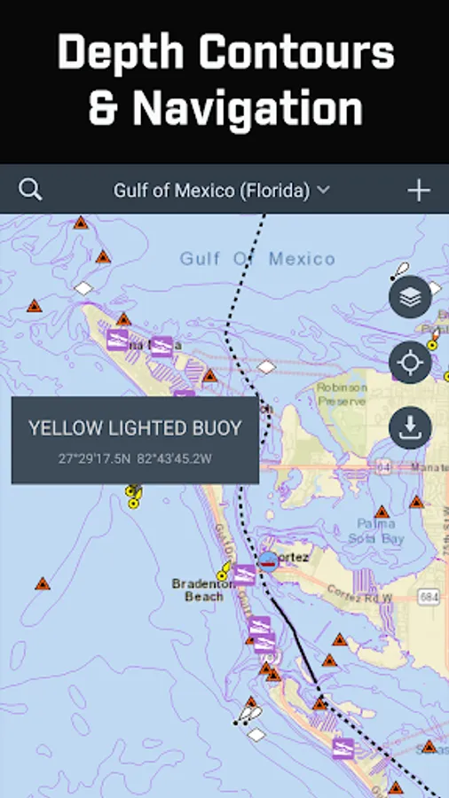 • Depth contours and navigation aids