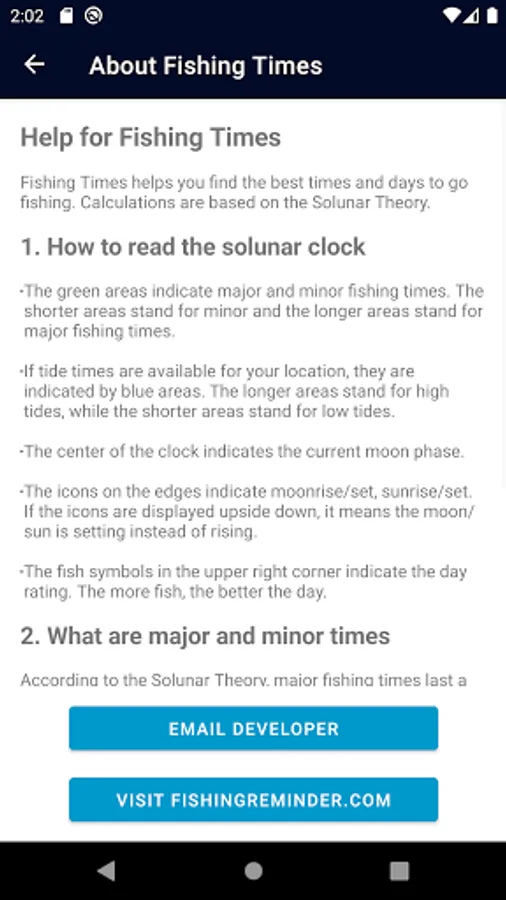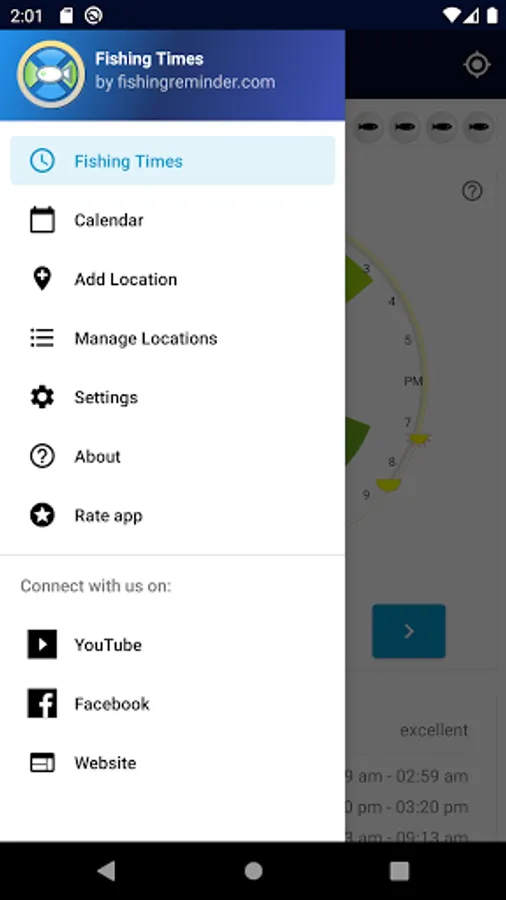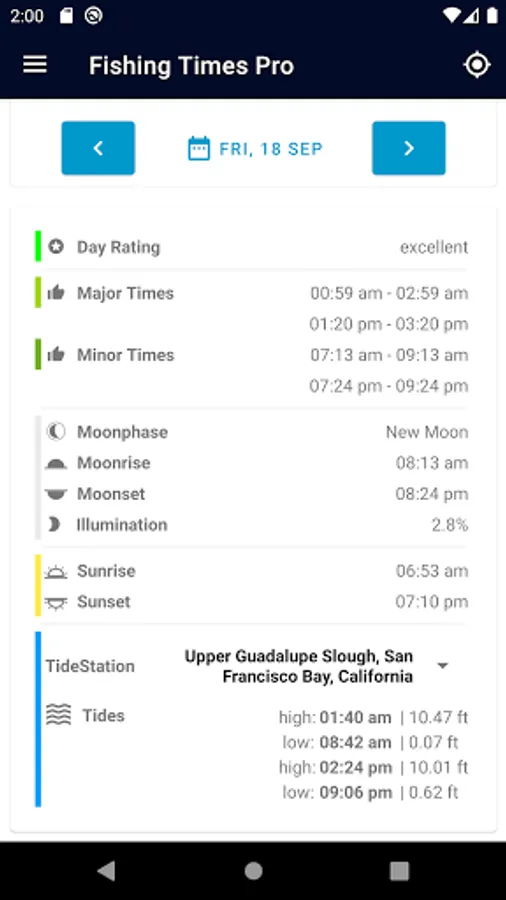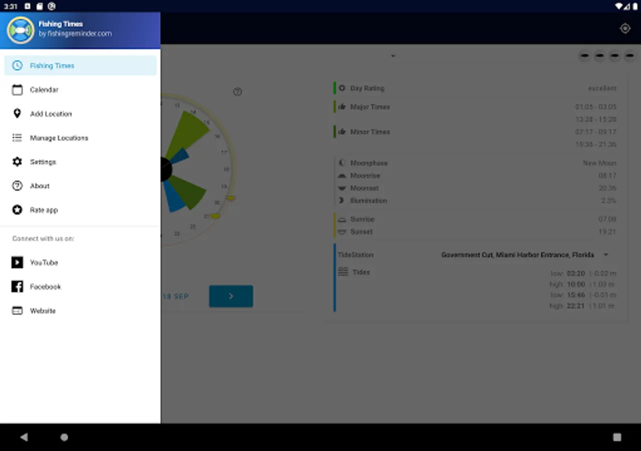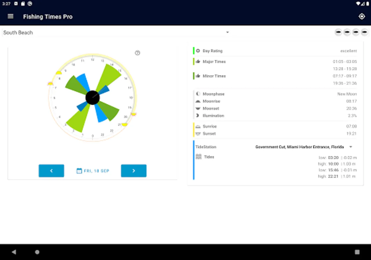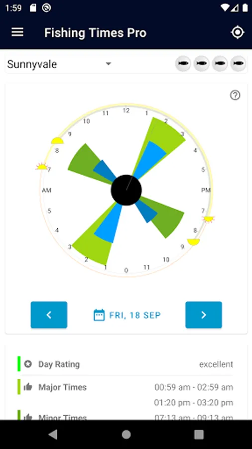 Fishing Times provides you with an easy-to-read interface for current, past and future fishing conditions. Major and Minor Times, Day Ratings, Tide Times, Sunrise, Sunset, Moonrise, Moonset and Moonphase are displayed in a 24-hour Solunar Clock view and can also be viewed in a calendar format.