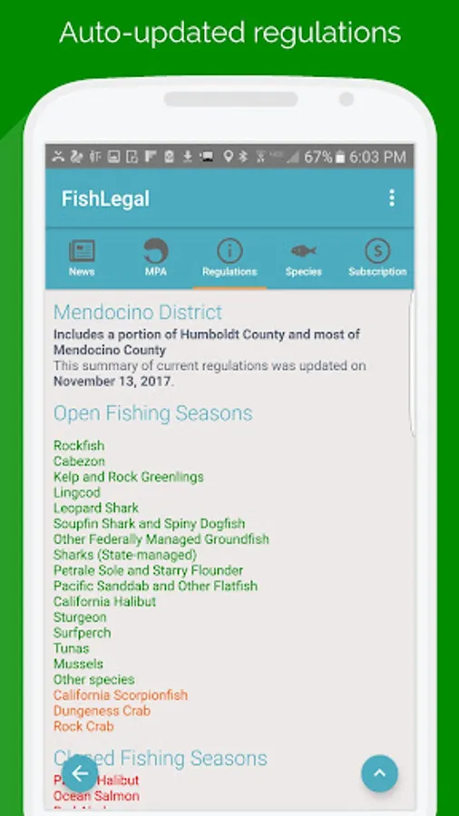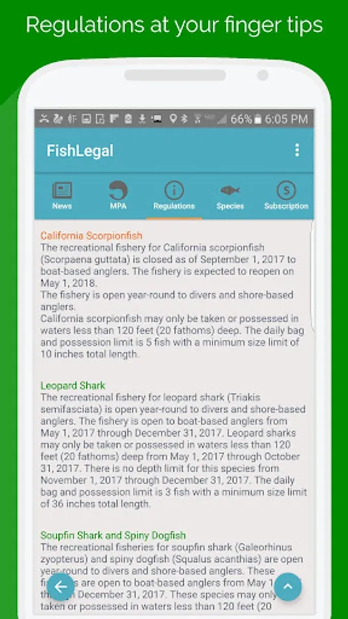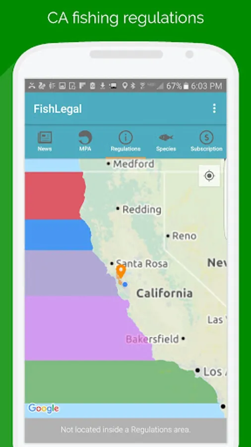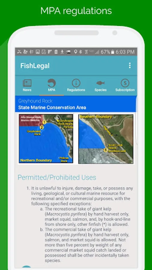 Pro Subscription will add detailed California salt-water fishing regulations, immediate update when regulations change, and beautiful fish identification information! All detailed maps and regulations are preloaded, just install the app and be done. You will always have the newest rules at your finger tip.