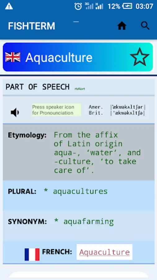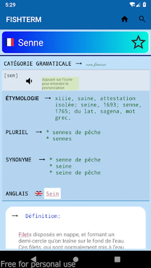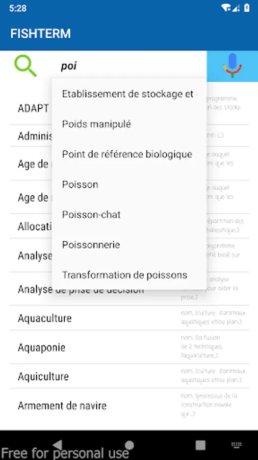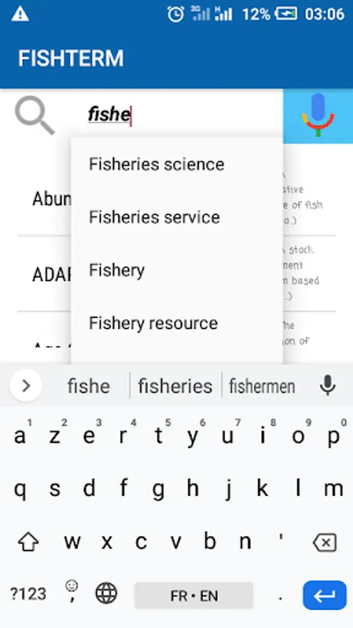 FISHTERM Bilingual fisheries dictionary is a free offline French - English bilingual fisheries dictionary.