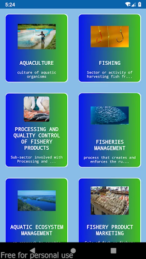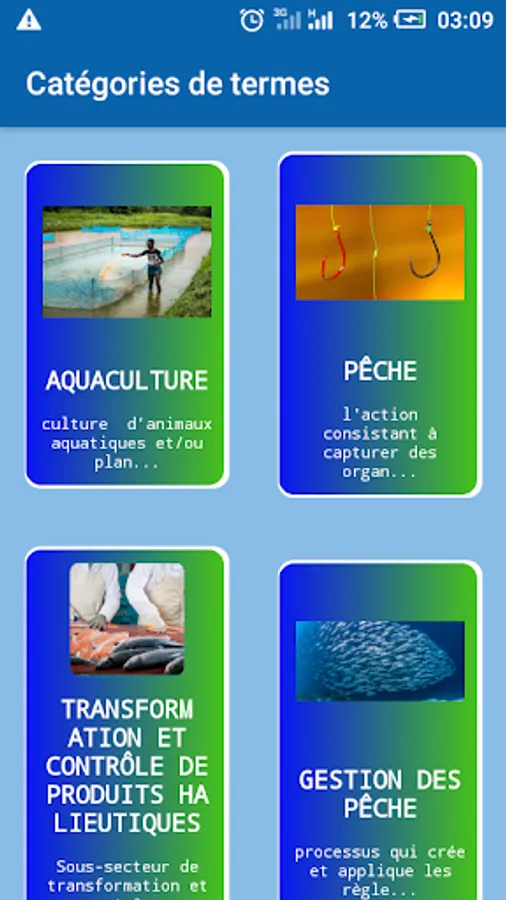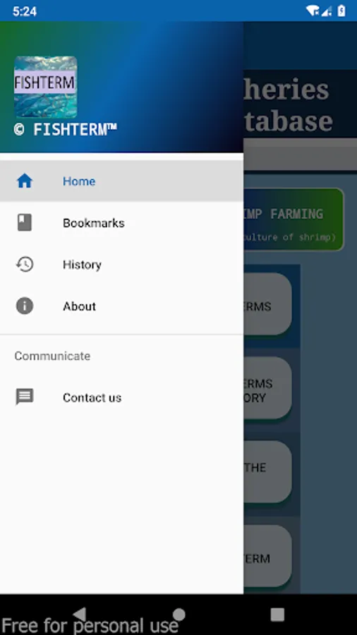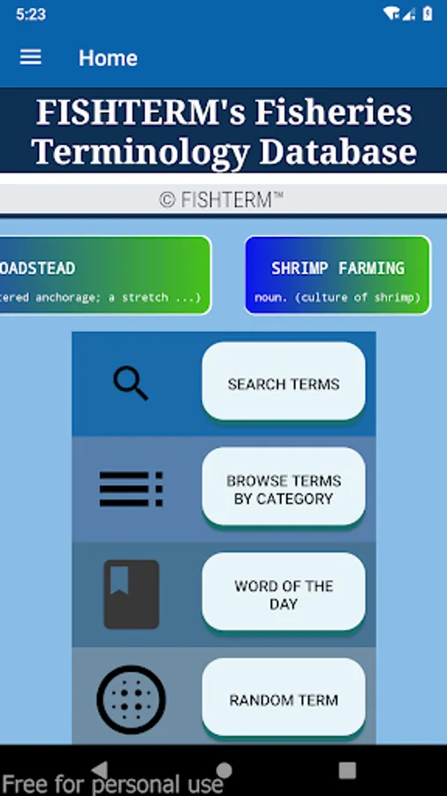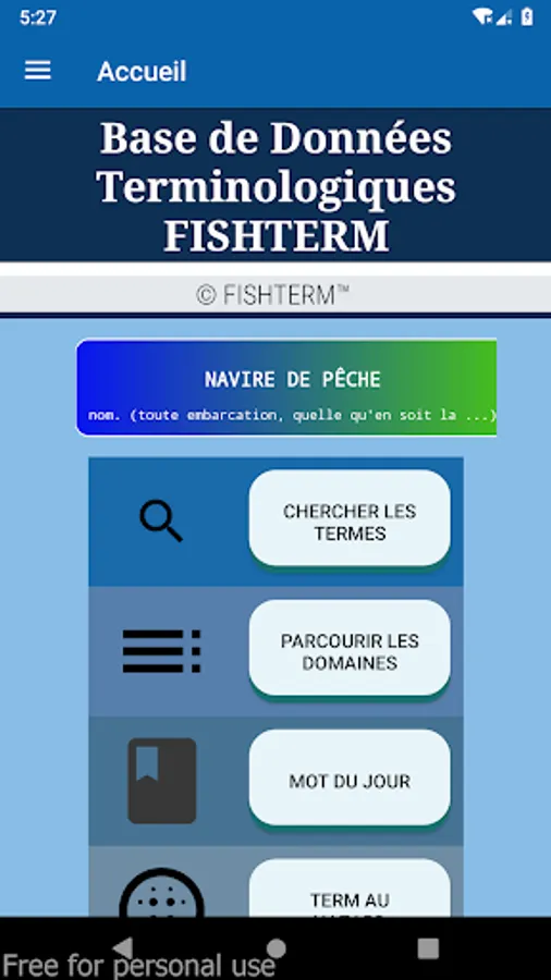 This app has been designed by FISHTERM, a venerated organisation specialised in fisheries terminology, and runs an online fisheries terminology database comprising terminology tools such as a bilingual fisheries dictionary, terminology records, quizzes, etc.